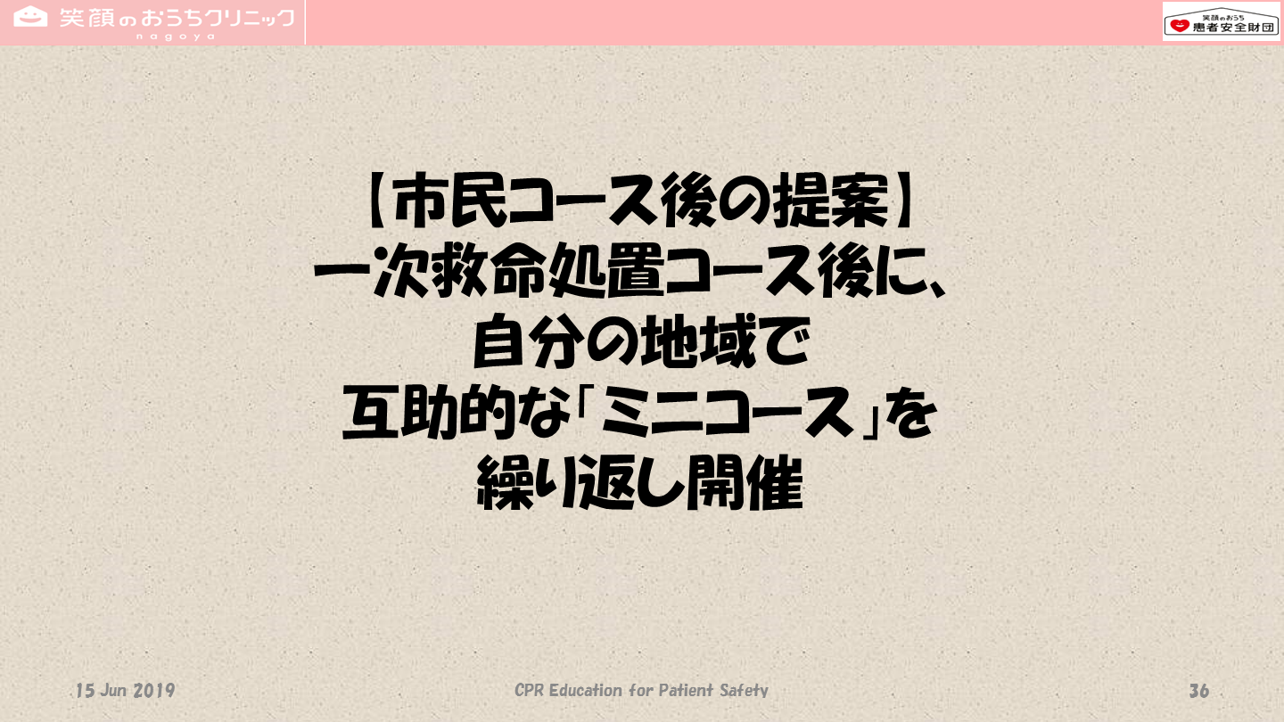 【市民コース後の提案】一次救命処置コース後に、自分の地域で互助的な「ミニコース」を繰り返し開催 CPR Education for Patient Safety 36 15 Jun 2019 #37.
