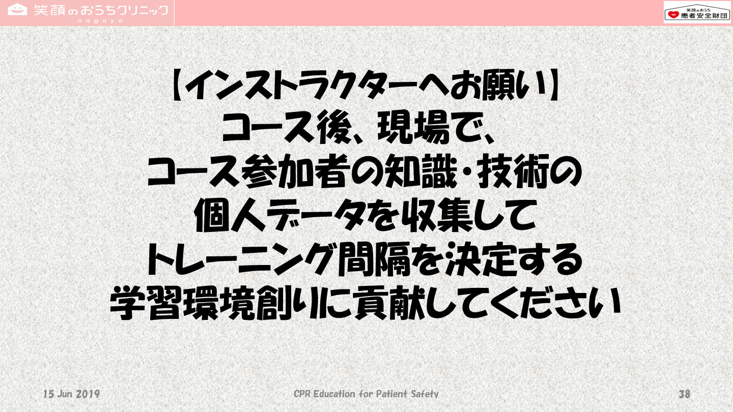 【インストラクターへお願い】コース後、現場で、コース参加者の知識・技術の個人データを収集してトレーニング間隔を決定する学習環境創りに貢献してください CPR Education for Patient Safety 38 15 Jun 2019 #39.
