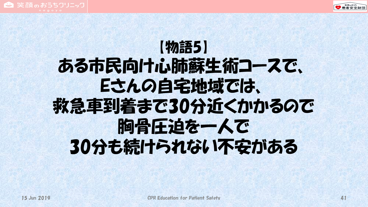 【物語5】ある市民向け心肺蘇生術コースで、Eさんの自宅地域では、救急車到着まで30分近くかかるので胸骨圧迫を一人で30分も続けられない不安がある CPR Education for Patient Safety 41 15 Jun 2019 #42.