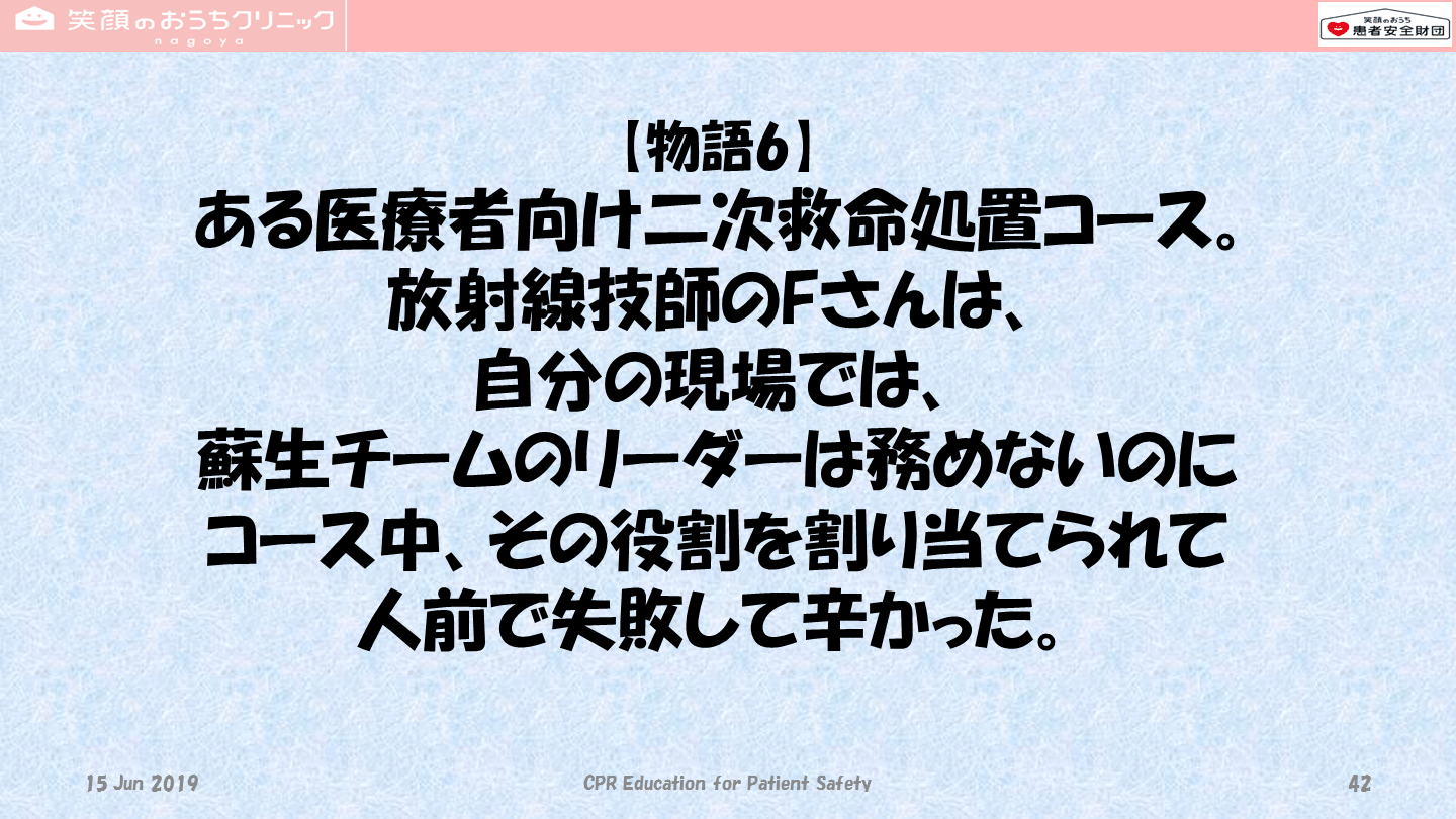 【物語6】ある医療者向け二次救命処置コース。放射線技師のFさんは、自分の現場では、蘇生チームのリーダーは務めないのにコース中、その役割を割り当てられて人前で失敗して辛かった。 CPR Education for Patient Safety 42 15 Jun 2019 #43.