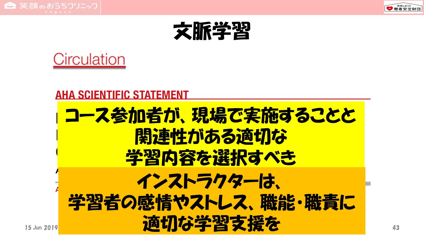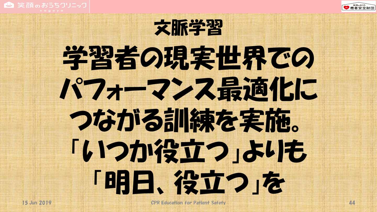 文脈学習 15 Jun 2019 CPR Education for Patient Safety 43 コース参加者が、現場で実施することと関連性がある適切な