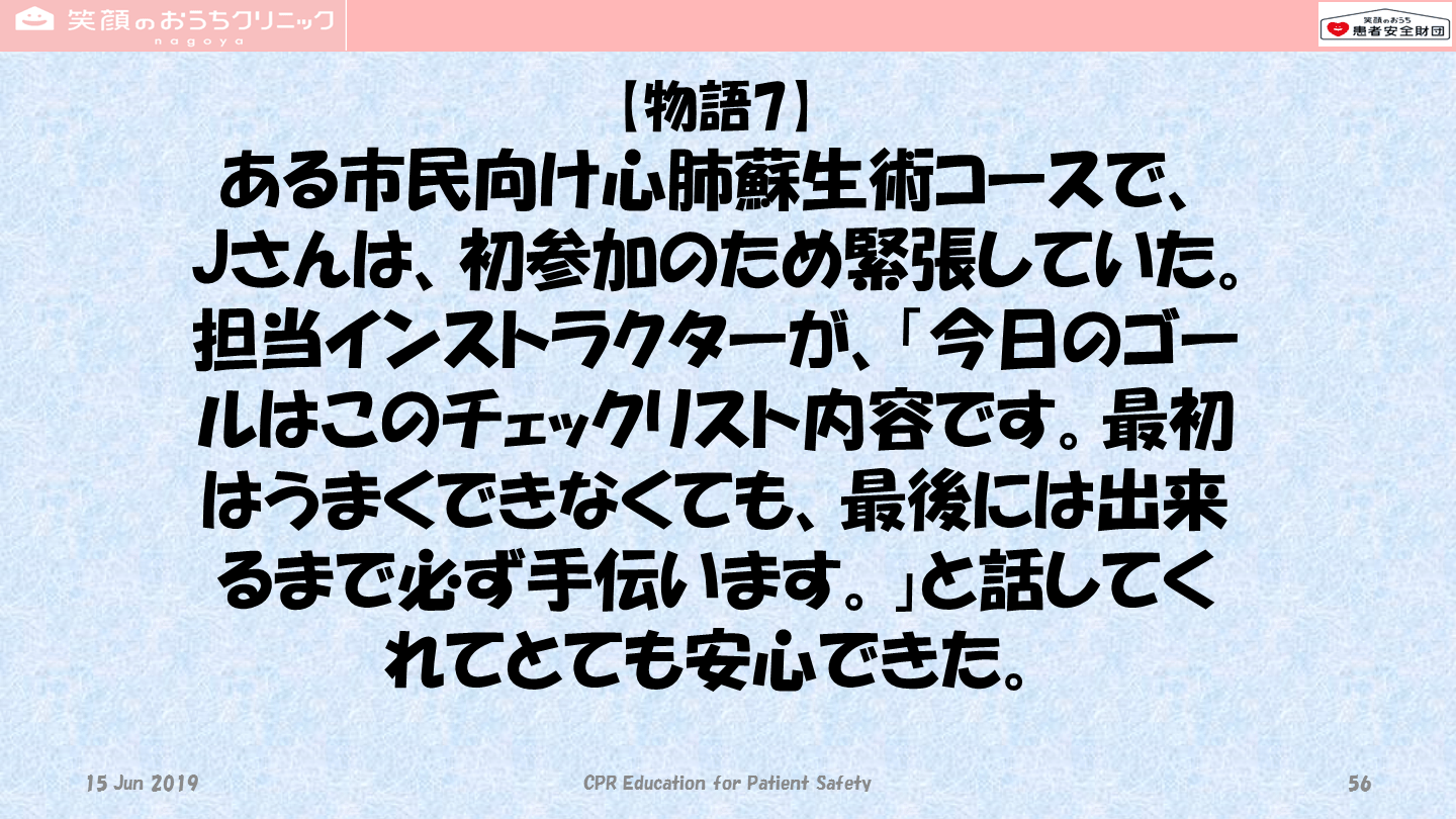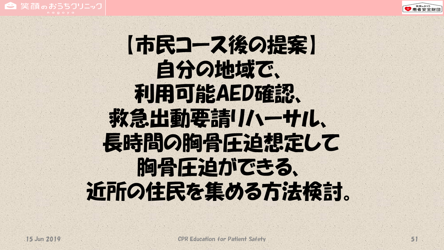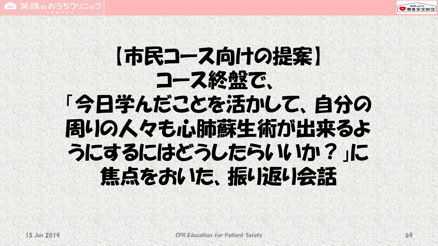 【市民コース後の提案】蘇生術で助かった方々の語り、蘇生術を実施した方々の語りなど「救命処置実施が、市民の常識」を目指した、対話の場を創りましょう CPR Education for Patient Safety 145 15 Jun 2019 #146.