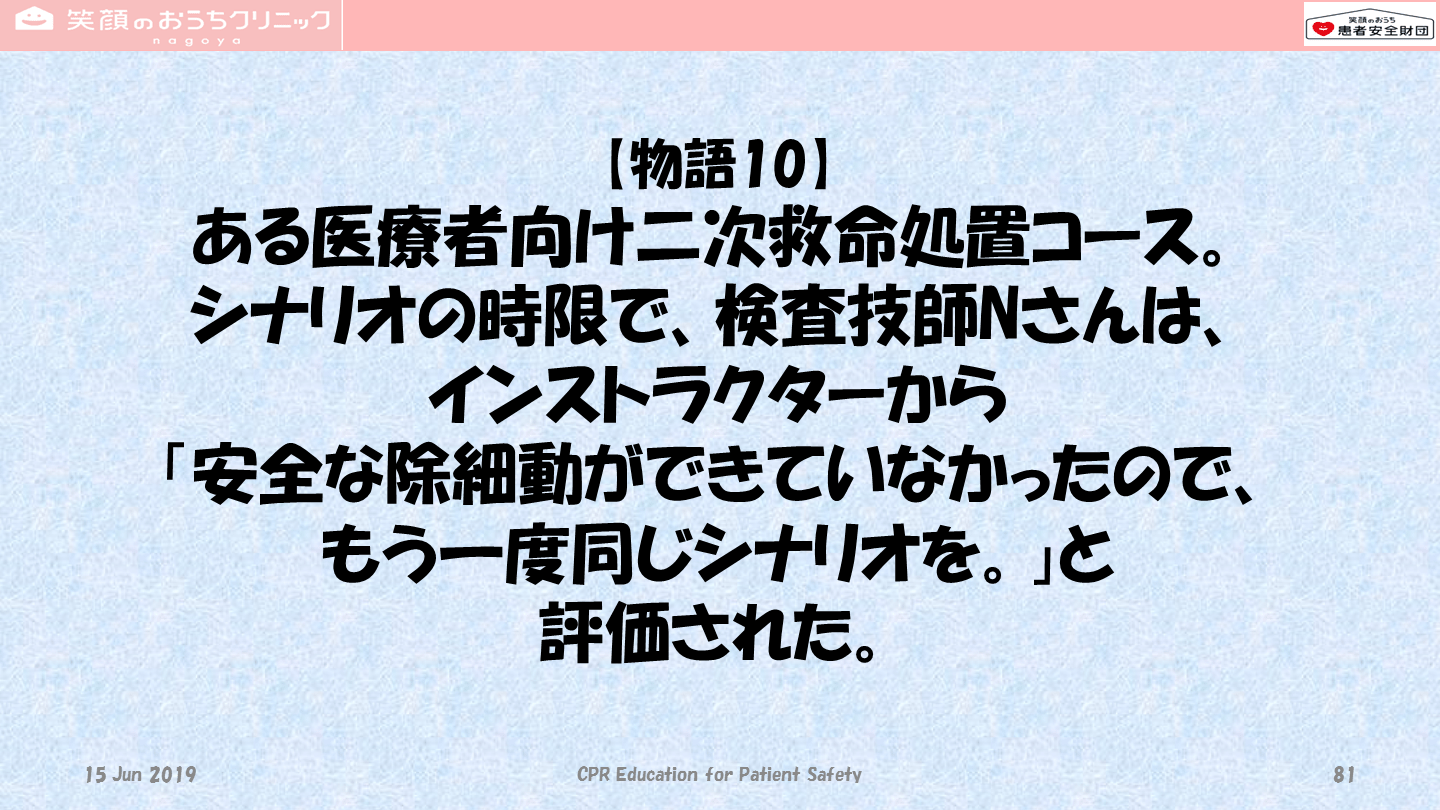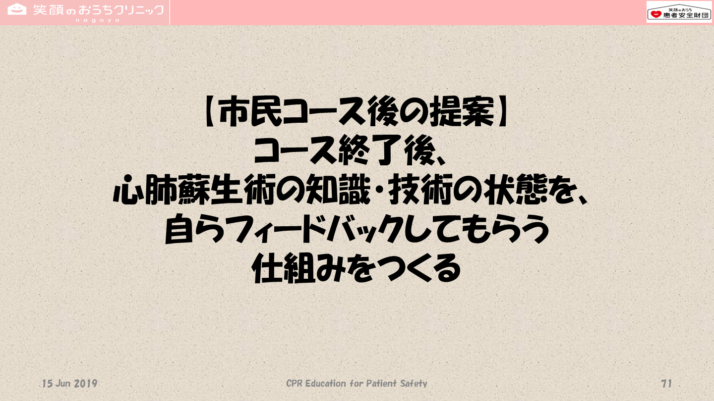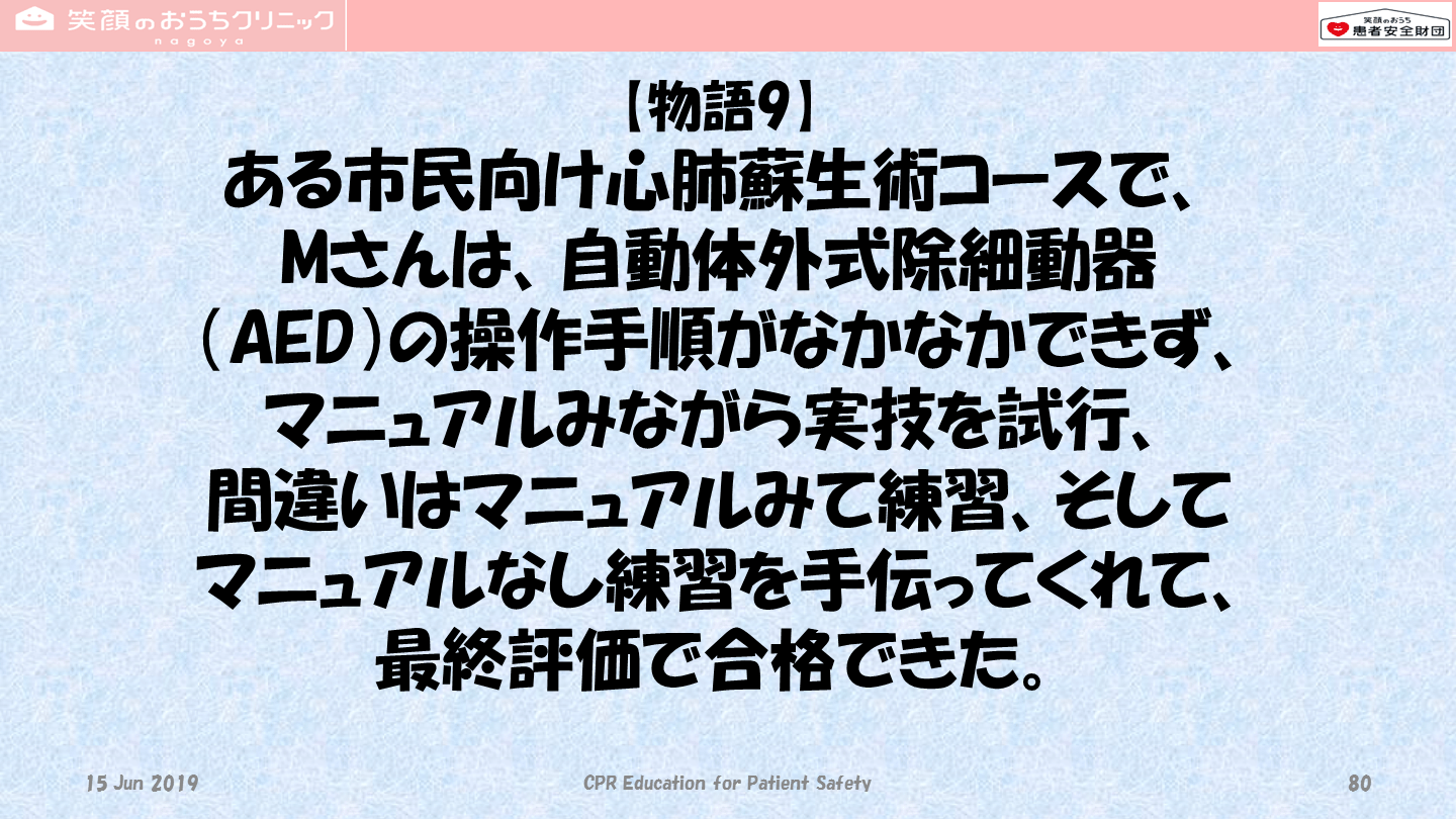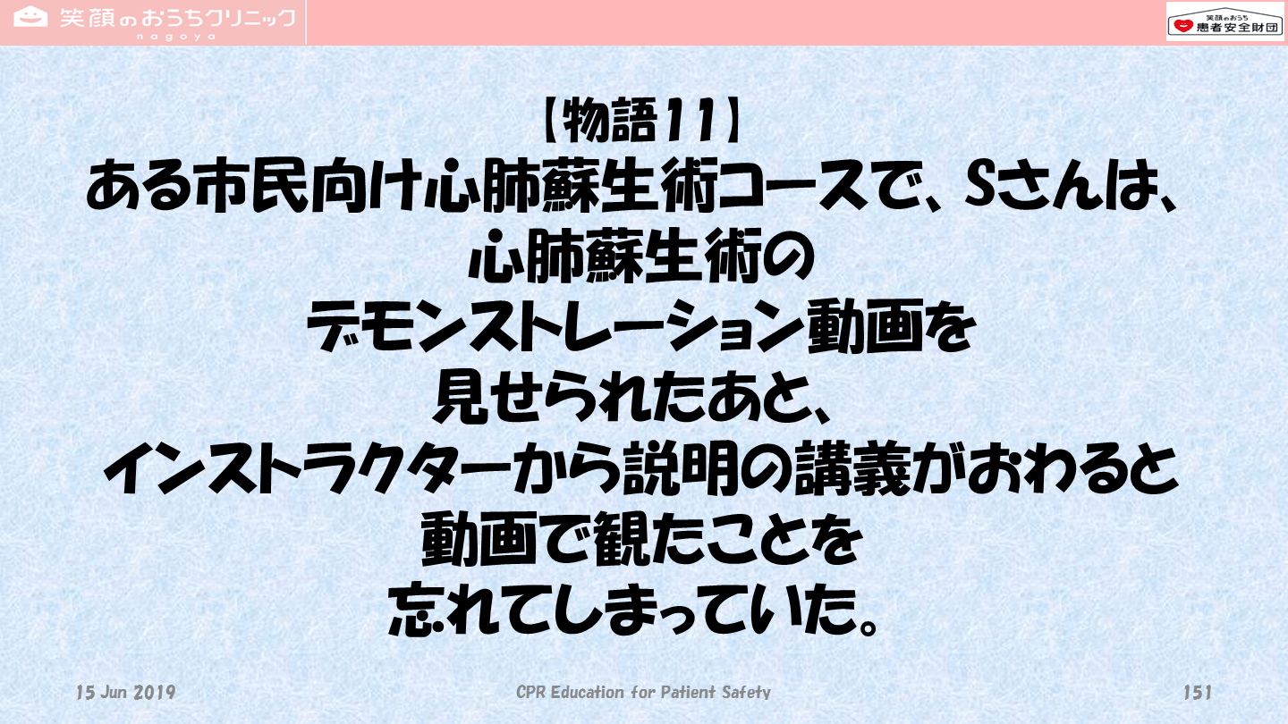 【市民コース後の提案】蘇生術で助かった方々の語り、蘇生術を実施した方々の語りなど「救命処置実施が、市民の常識」を目指した、対話の場を創りましょう CPR Education for Patient Safety 145 15 Jun 2019 #146.