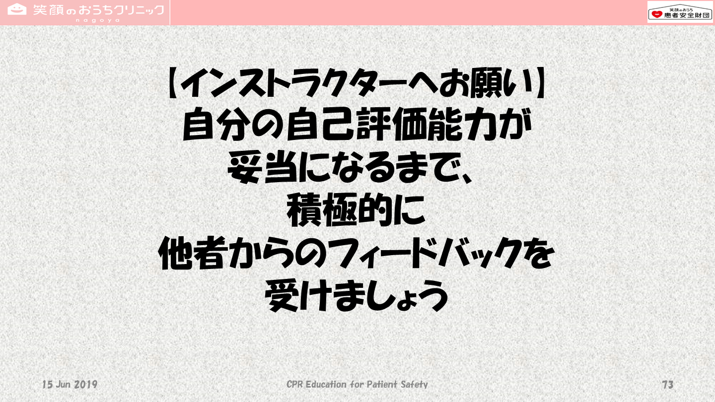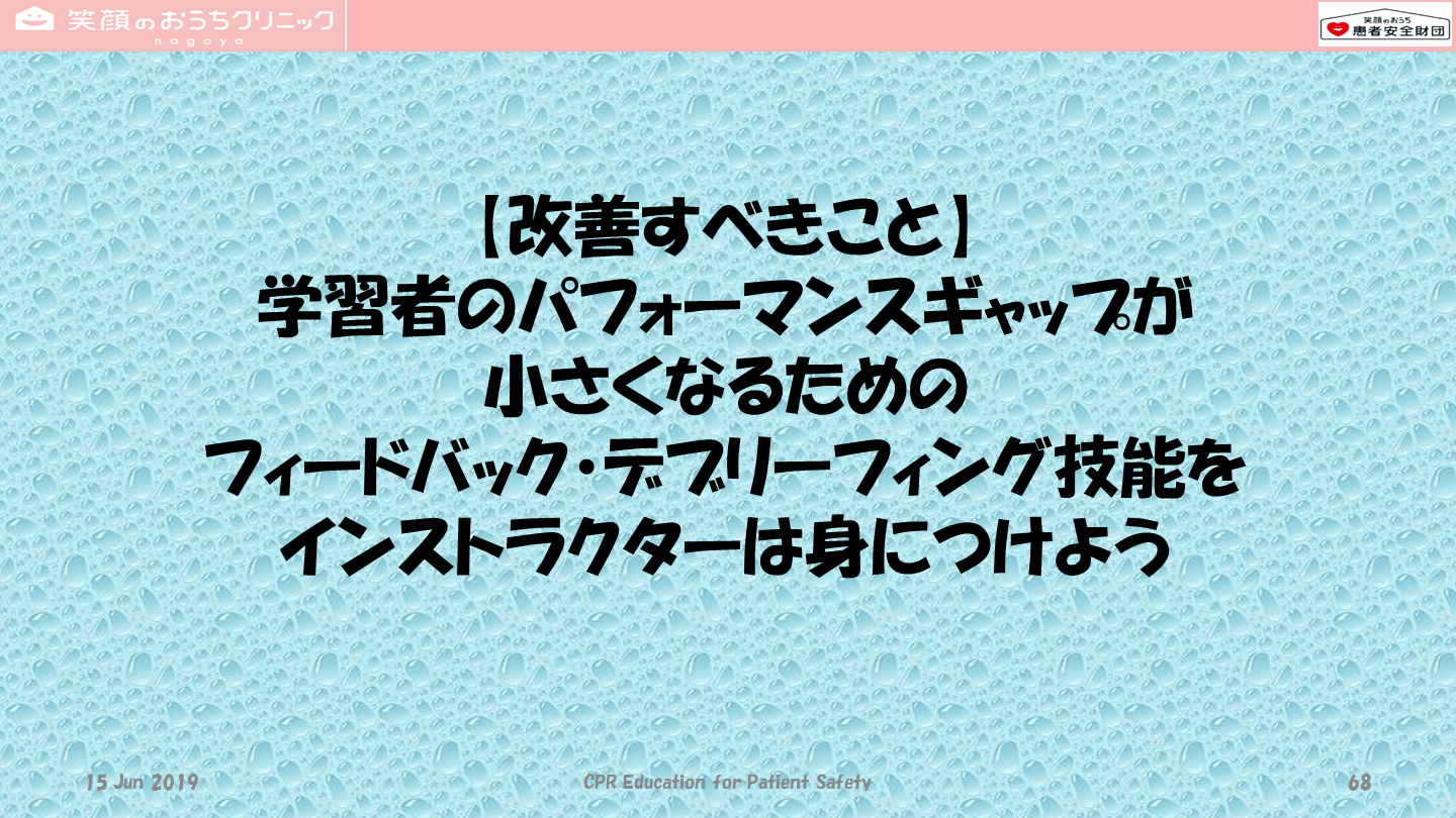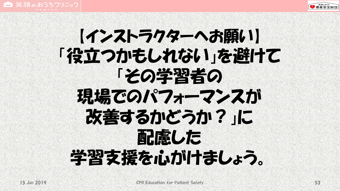 【インストラクターへお願い】「完全に習得できた!」を保証できるインストラクションや、ゴール達成が困難あれば適切なフィードバックができるインストラクション技能を身に着けましょう CPR Education for Patient Safety 20 15 Jun 2019 #21.