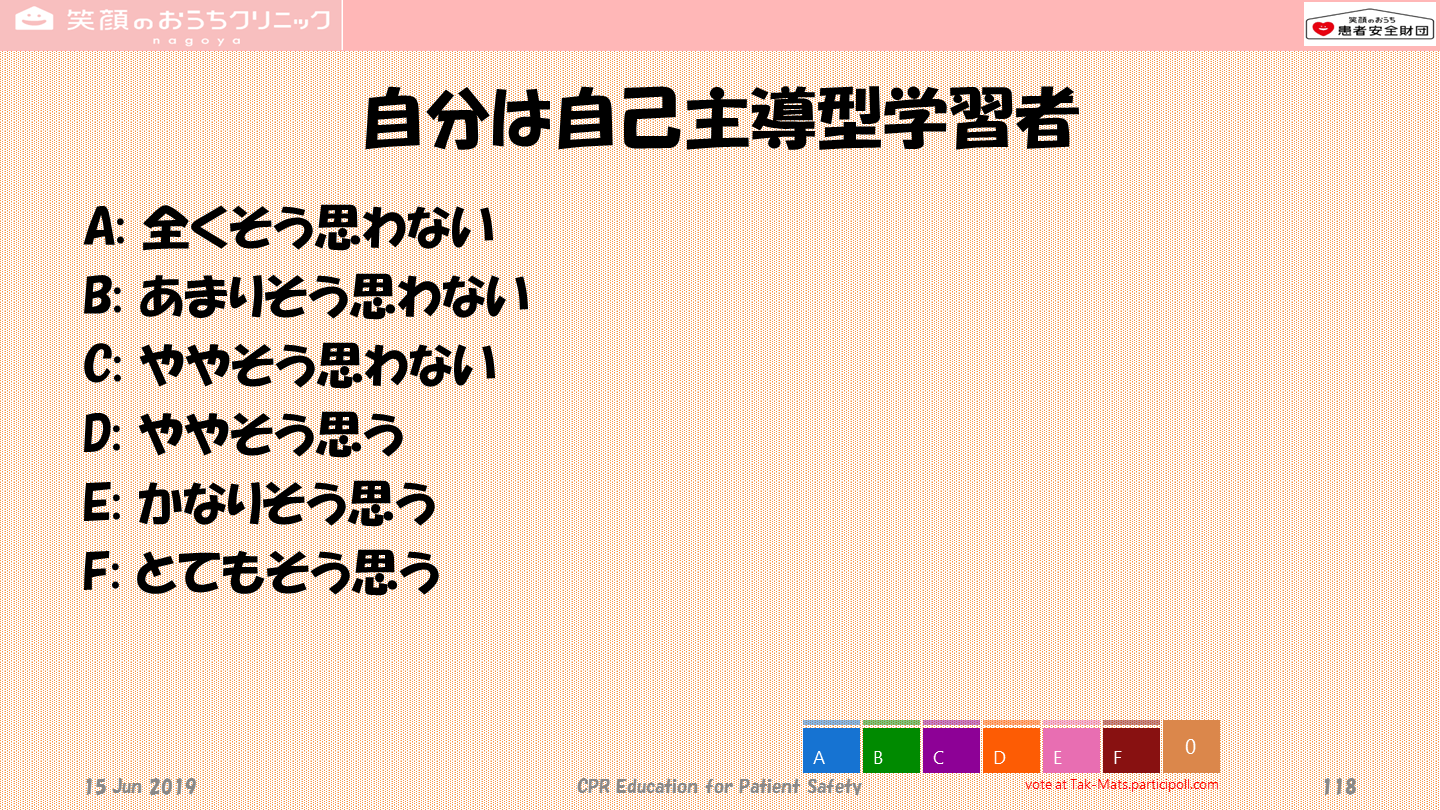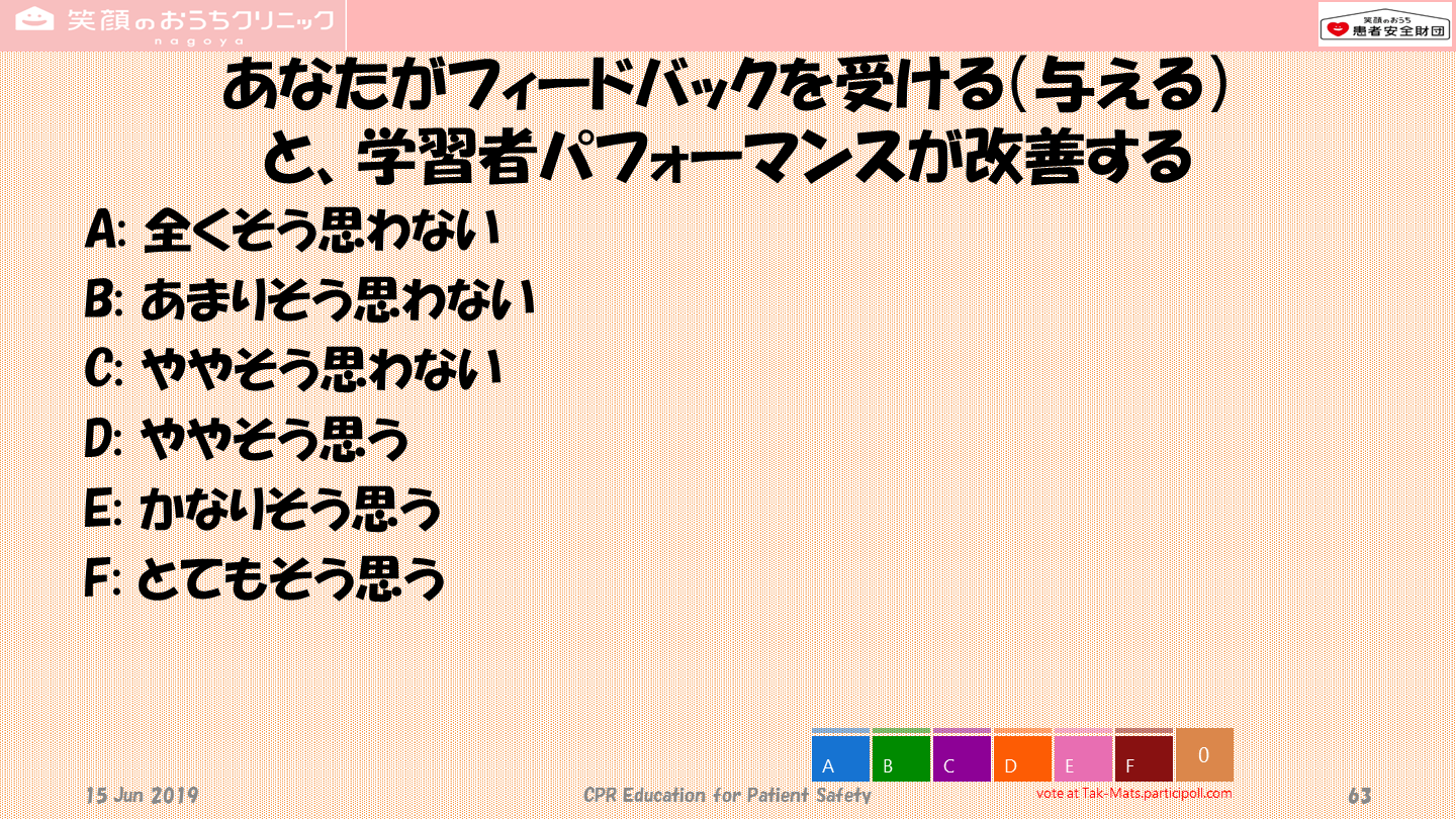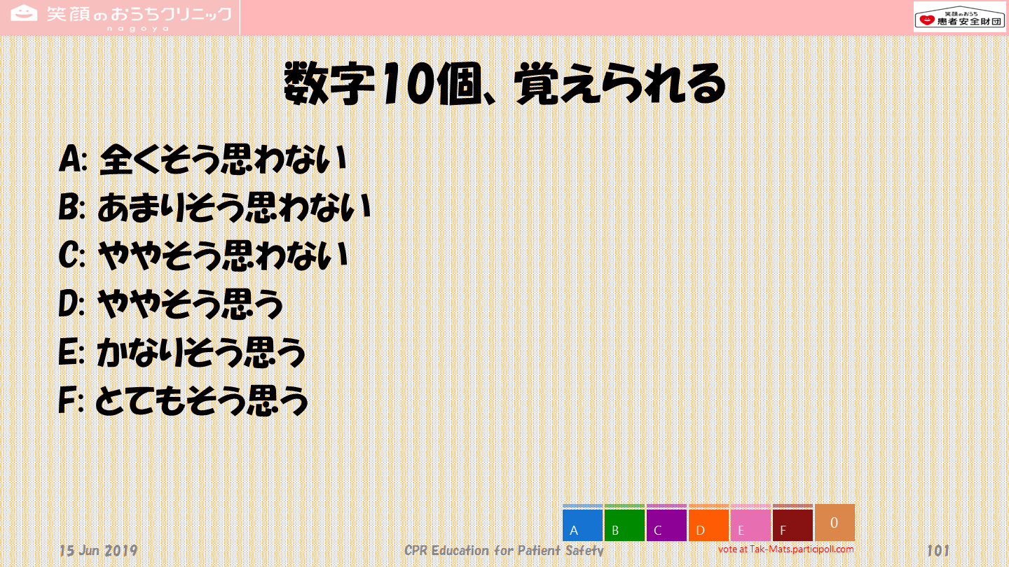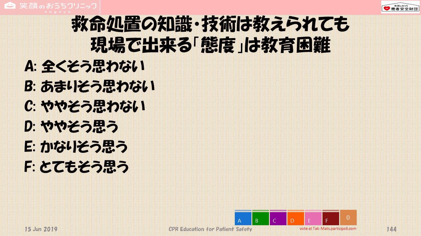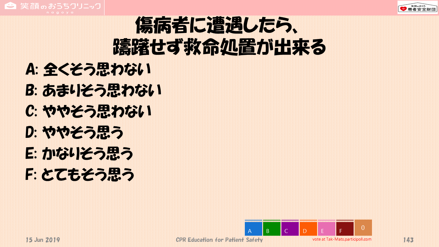 F: とてもそう思う CPR Education for Patient Safety 143 0 vote at Tak-Mats.participoll.com A B C D E F 15 Jun 2019 #144.