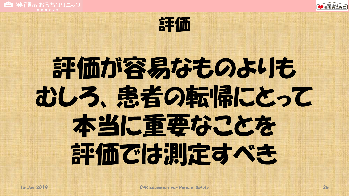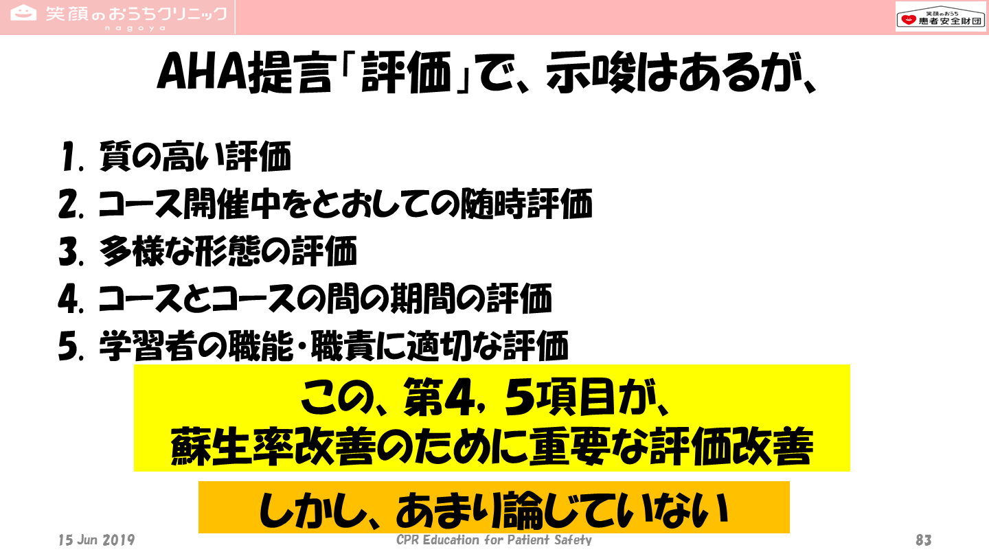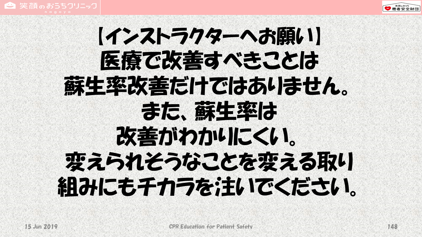 【インストラクターへお願い】医療で改善すべきことは蘇生率改善だけではありません。また、蘇生率は改善がわかりにくい。変えられそうなことを変える取り組みにもチカラを注いでください。 CPR Education for Patient Safety 148 15 Jun 2019 #149.