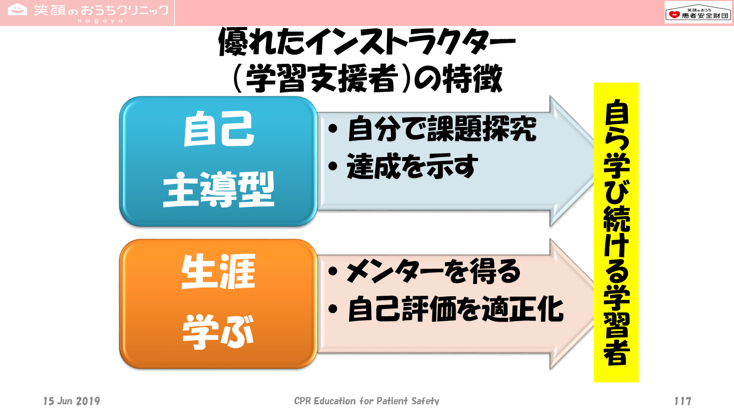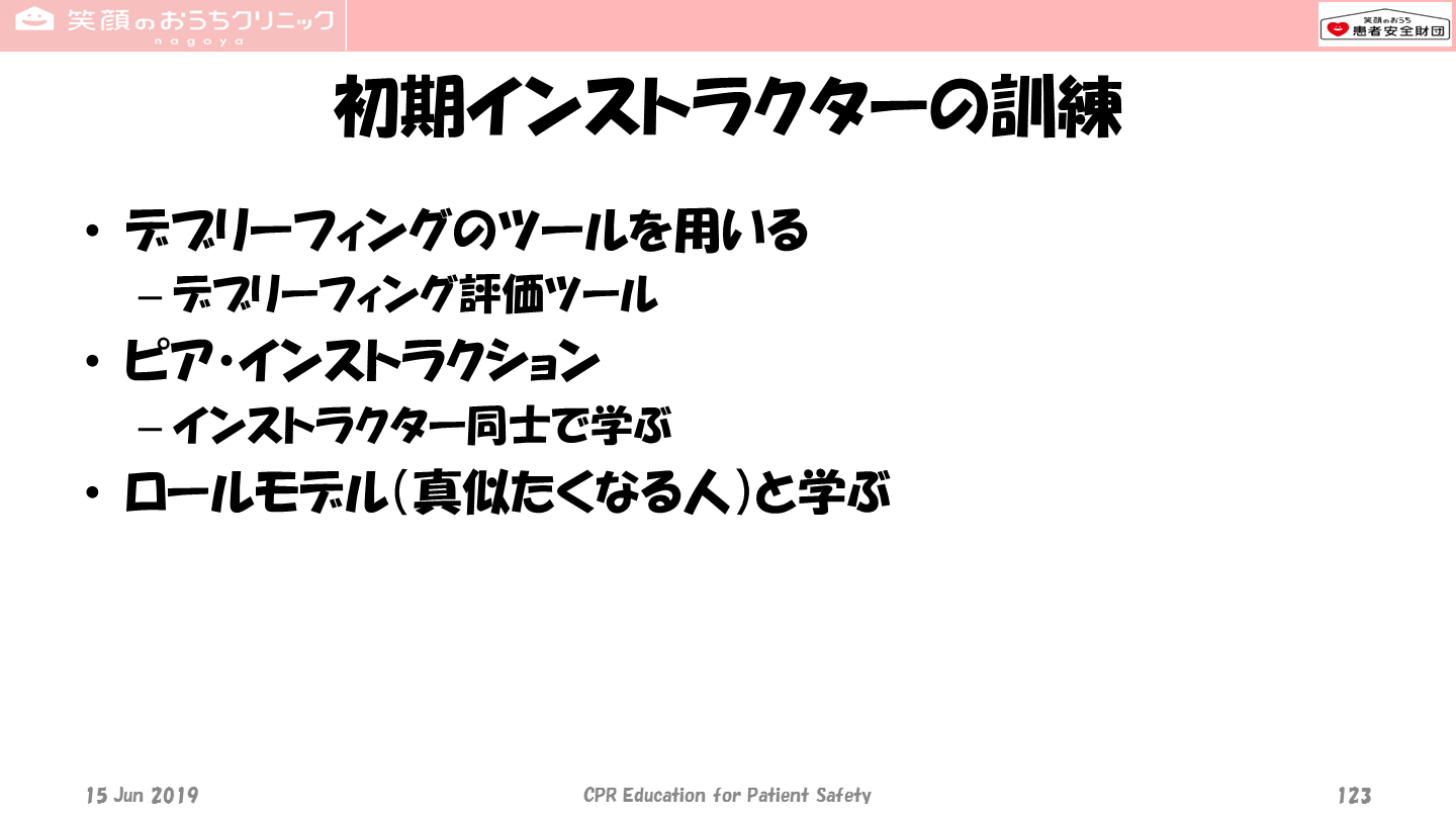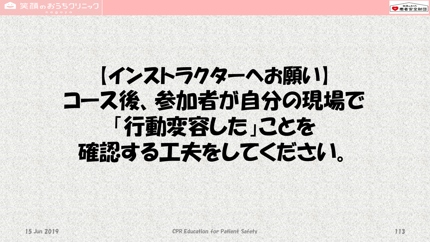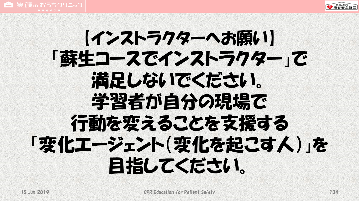 【インストラクターへお願い】「蘇生コースでインストラクター」で満足しないでください。学習者が自分の現場で行動を変えることを支援する「変化エージェント(変化を起こす人)」を目指してください。 CPR Education for Patient Safety 134 15 Jun 2019 #135.