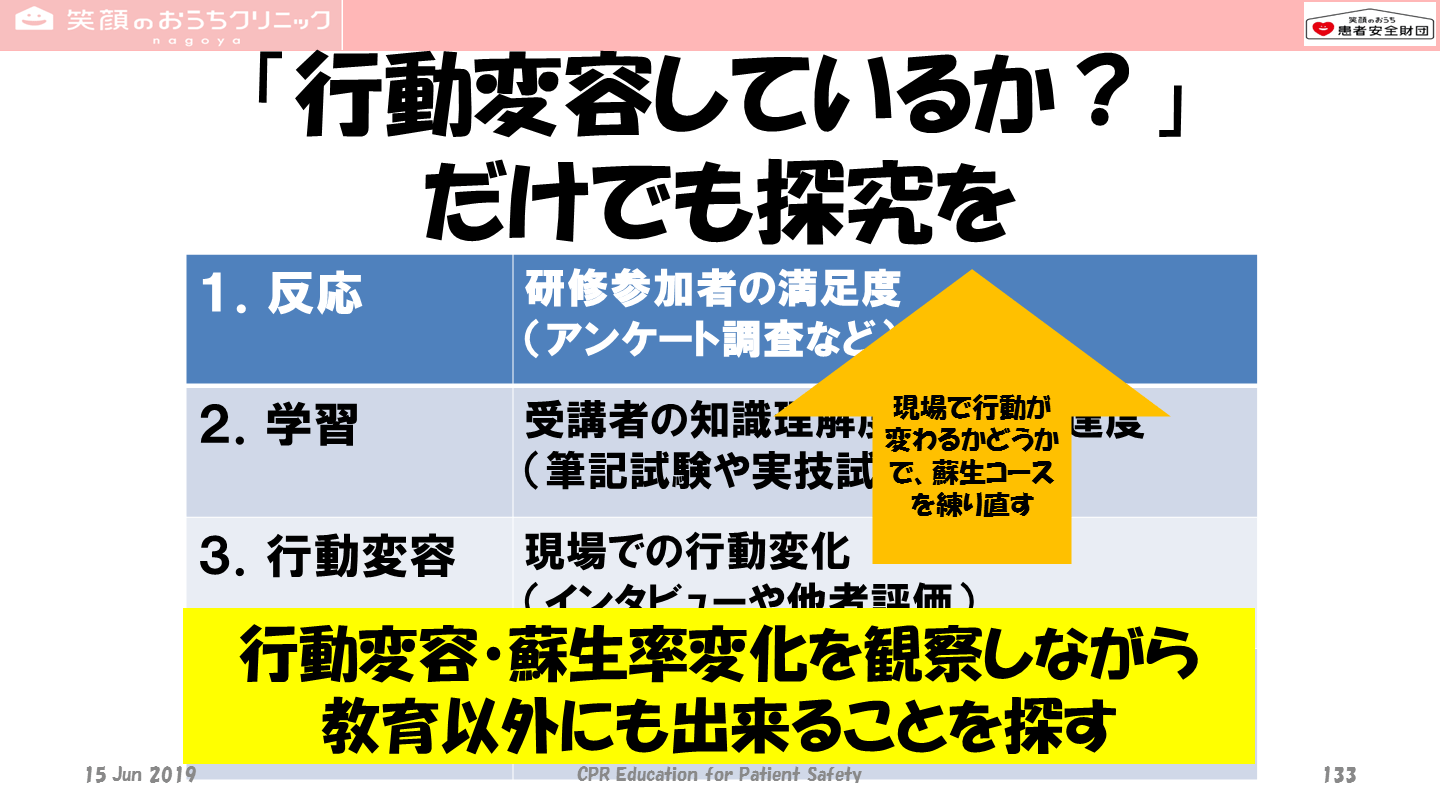 「行動変容しているか?」だけでも探究を 15 Jun 2019 CPR Education for Patient Safety 行動変容・蘇生率変化を観察しながら