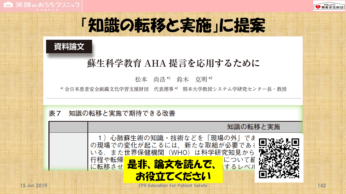 「知識の転移と実施」に提案 15 Jun 2019 CPR Education for Patient Safety 142 是非、論文を読んで、