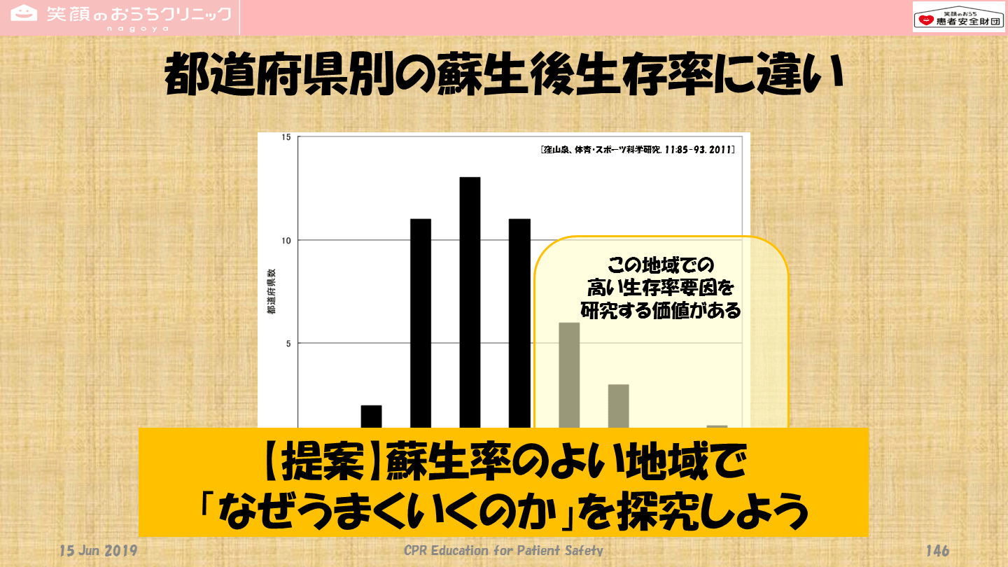 都道府県別の蘇生後生存率に違い 15 Jun 2019 CPR Education for Patient Safety 146 この地域での