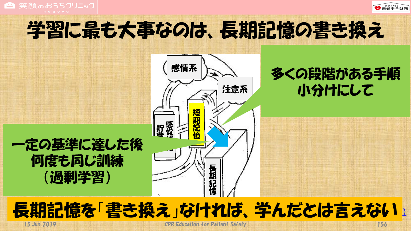 過剰学習を用いましょう 【過剰学習】一定の基準に達した後も、更に同じ訓練を繰り返し、学習すること 完全習得学習・集中的練習と認知負荷 #156. 学習に最も大事なのは、長期記憶の書き換え 15 Jun 2019 CPR Education for Patient Safety 156 (https://bit.ly/2W0ZpUB) 感覚情報