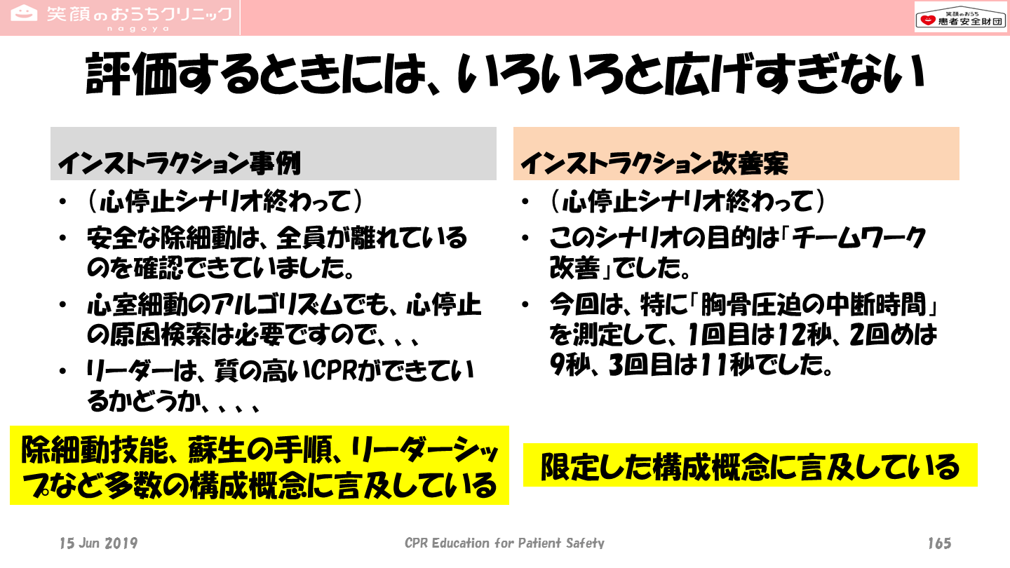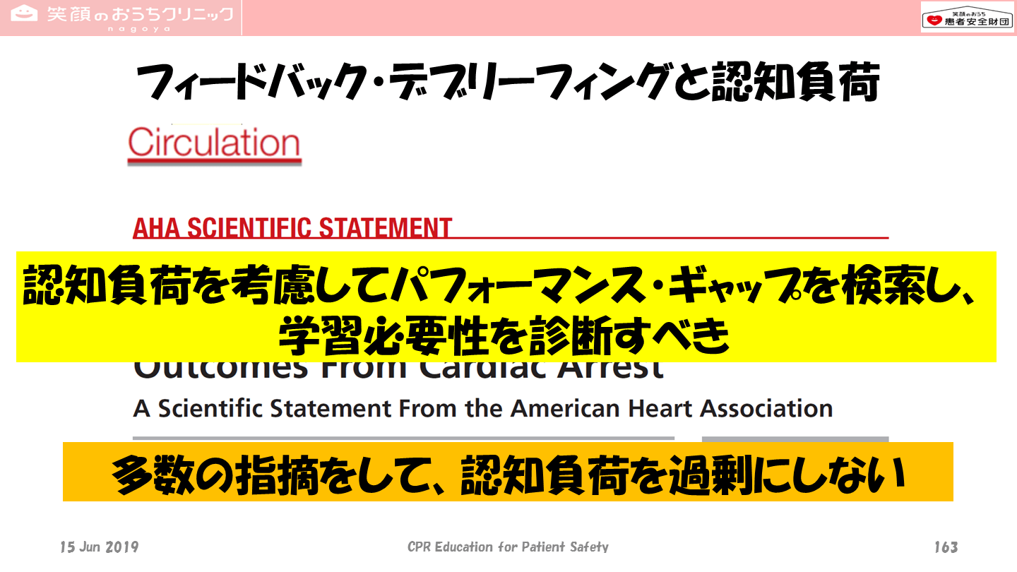 フィードバック・デブリーフィングと認知負荷 15 Jun 2019 CPR Education for Patient Safety 163 認知負荷を考慮してパフォーマンス・ギャップを検索し、学習必要性を診断すべき 多数の指摘をして、認知負荷を過剰にしない #164.