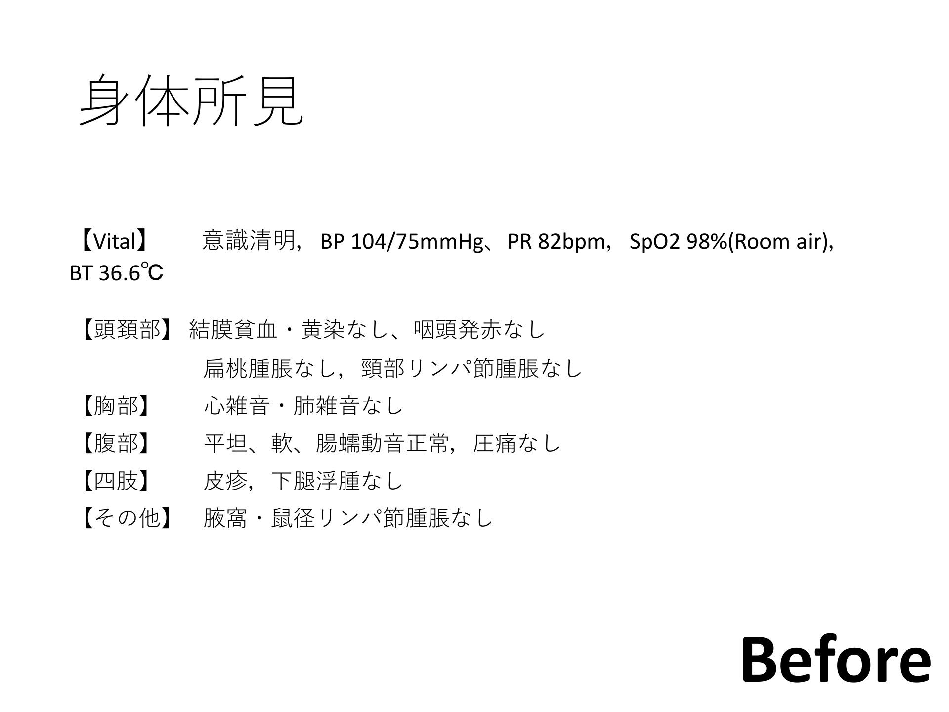 #10. 身体所見 【Vital】 BT 36.6℃ 意識清明,BP 104/75mmHg、PR 82bpm,SpO2 98%(Room air), 【頭頚部】 結膜貧血・黄染なし、咽頭発赤なし 扁桃腫脹なし,頸部リンパ節腫脹なし 【胸部】 心雑音・肺雑音なし 【腹部】 平坦、軟、腸蠕動音正常,圧痛なし 【四肢】 皮疹,下腿浮腫なし 【その他】 腋窩・鼠径リンパ節腫脹なし Before