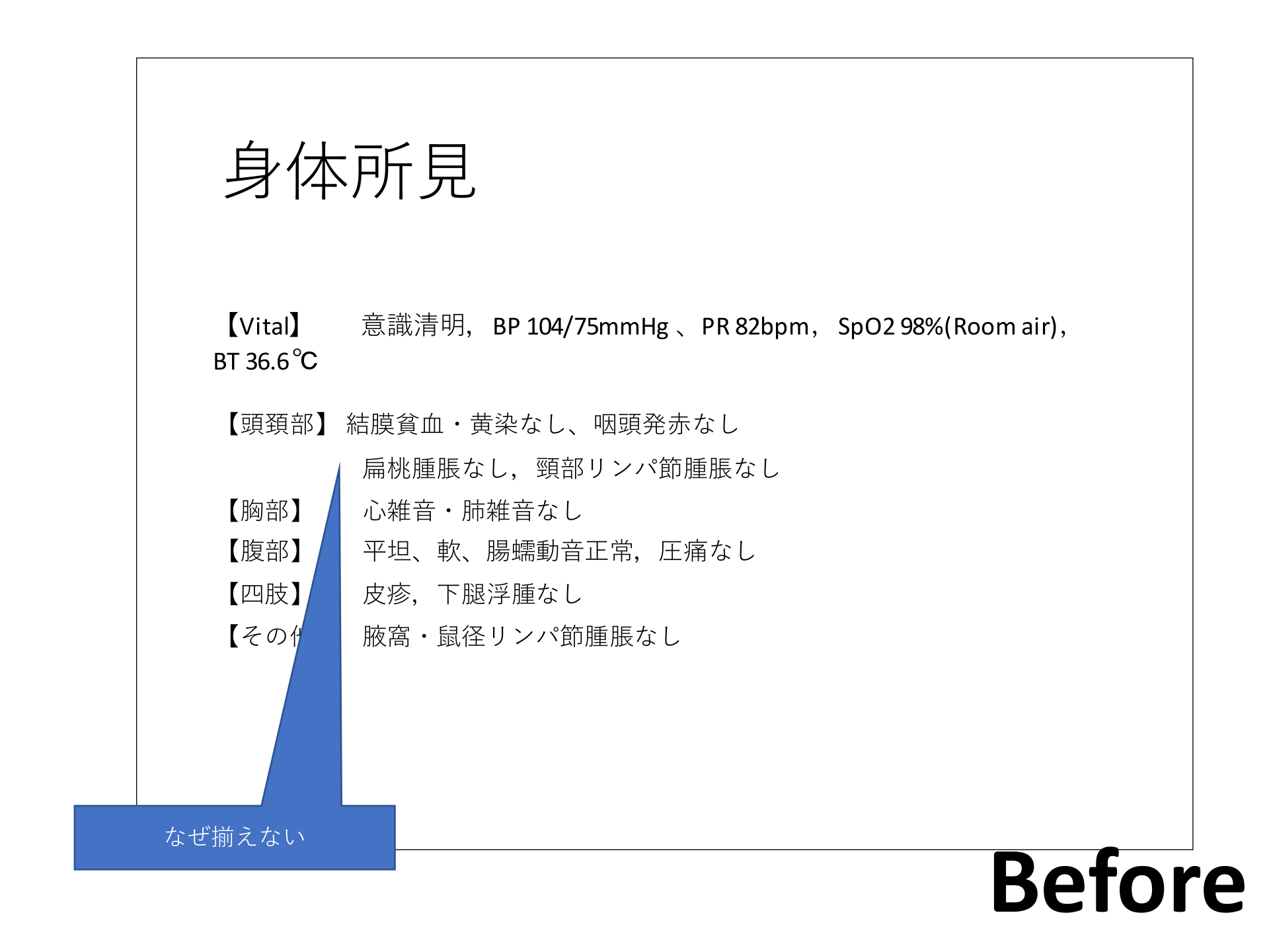#11. 【 】 意識清明, 、 , , 【頭頚部】 結膜貧血・黄染なし、咽頭発赤なし 扁桃腫脹なし,頸部リンパ節腫脹なし 【胸部】 心雑音・肺雑音なし 【腹部】 平坦、軟、腸蠕動音正常,圧痛なし 【四肢】 皮疹,下腿浮腫なし 【その他】 腋窩・鼠径リンパ節腫脹なし なぜ揃えない Before