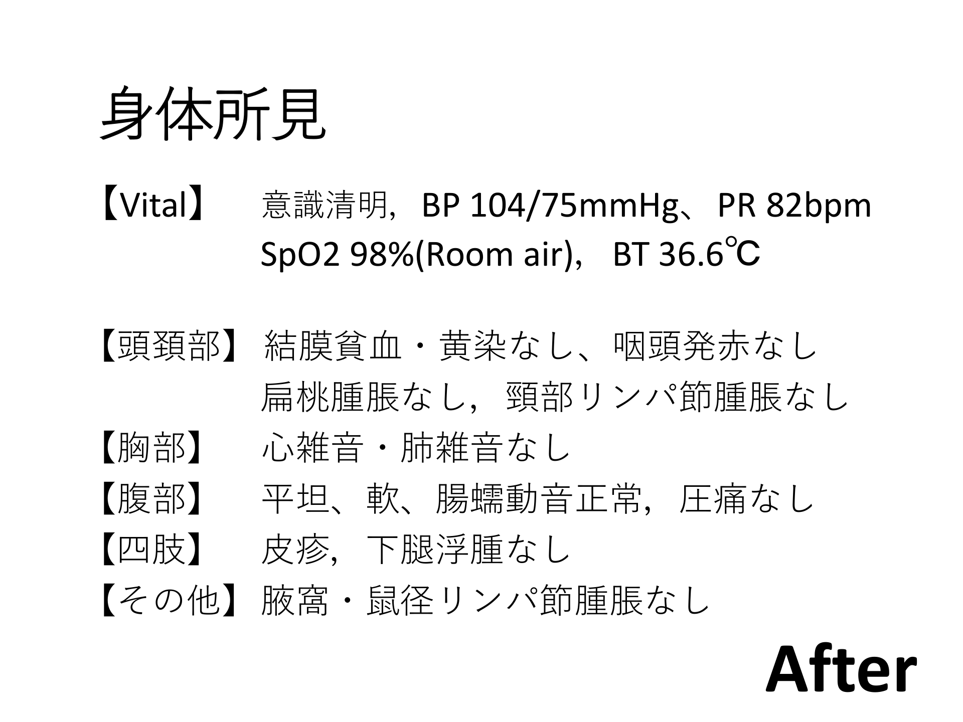 #12. 身体所見 【Vital】 意識清明,BP 104/75mmHg、PR 82bpm SpO2 98%(Room air),BT 36.6℃ 【頭頚部】 結膜貧血・黄染なし、咽頭発赤なし 扁桃腫脹なし,頸部リンパ節腫脹なし 【胸部】 心雑音・肺雑音なし 【腹部】 平坦、軟、腸蠕動音正常,圧痛なし 【四肢】 皮疹,下腿浮腫なし 【その他】 腋窩・鼠径リンパ節腫脹なし After
