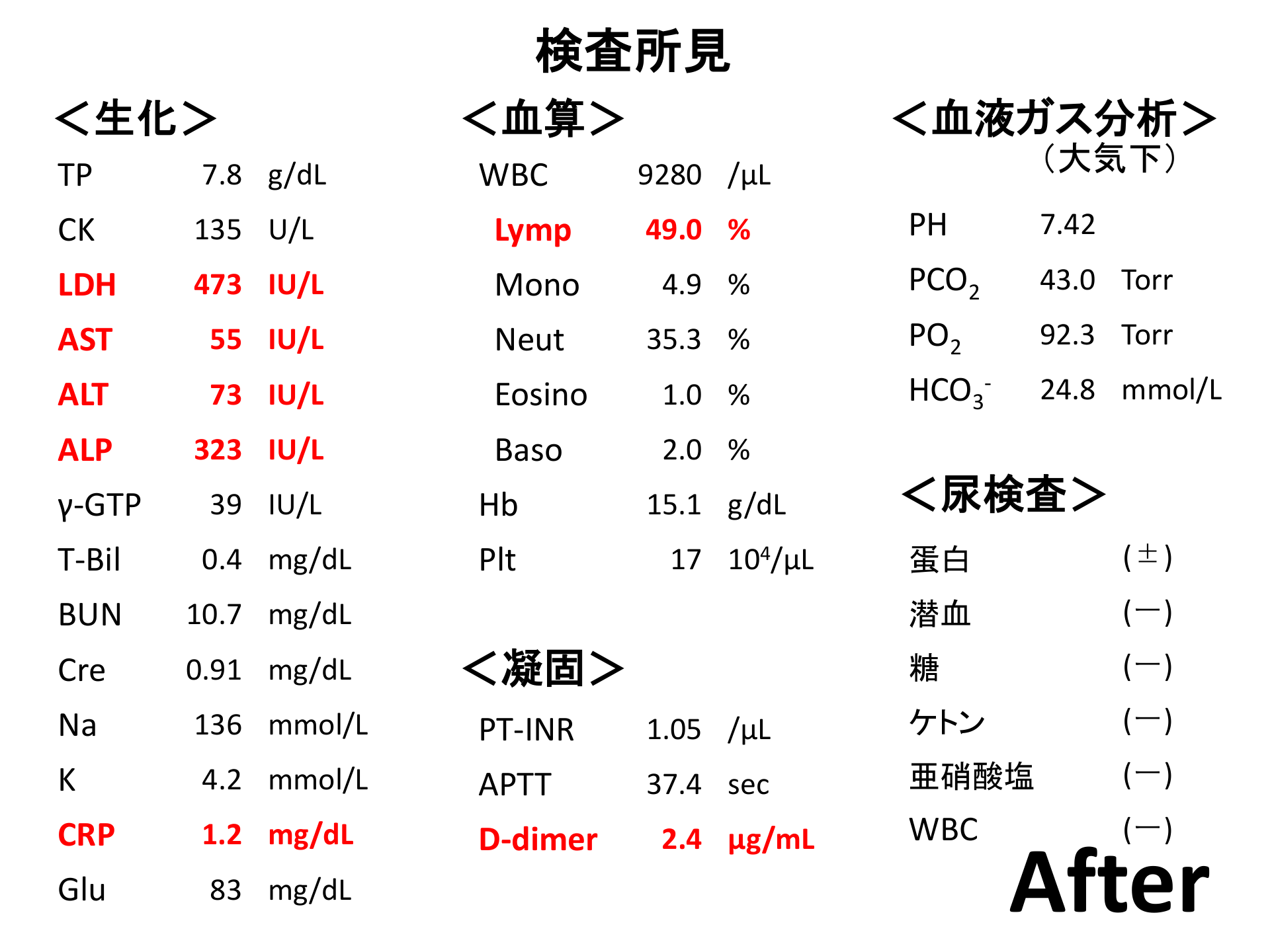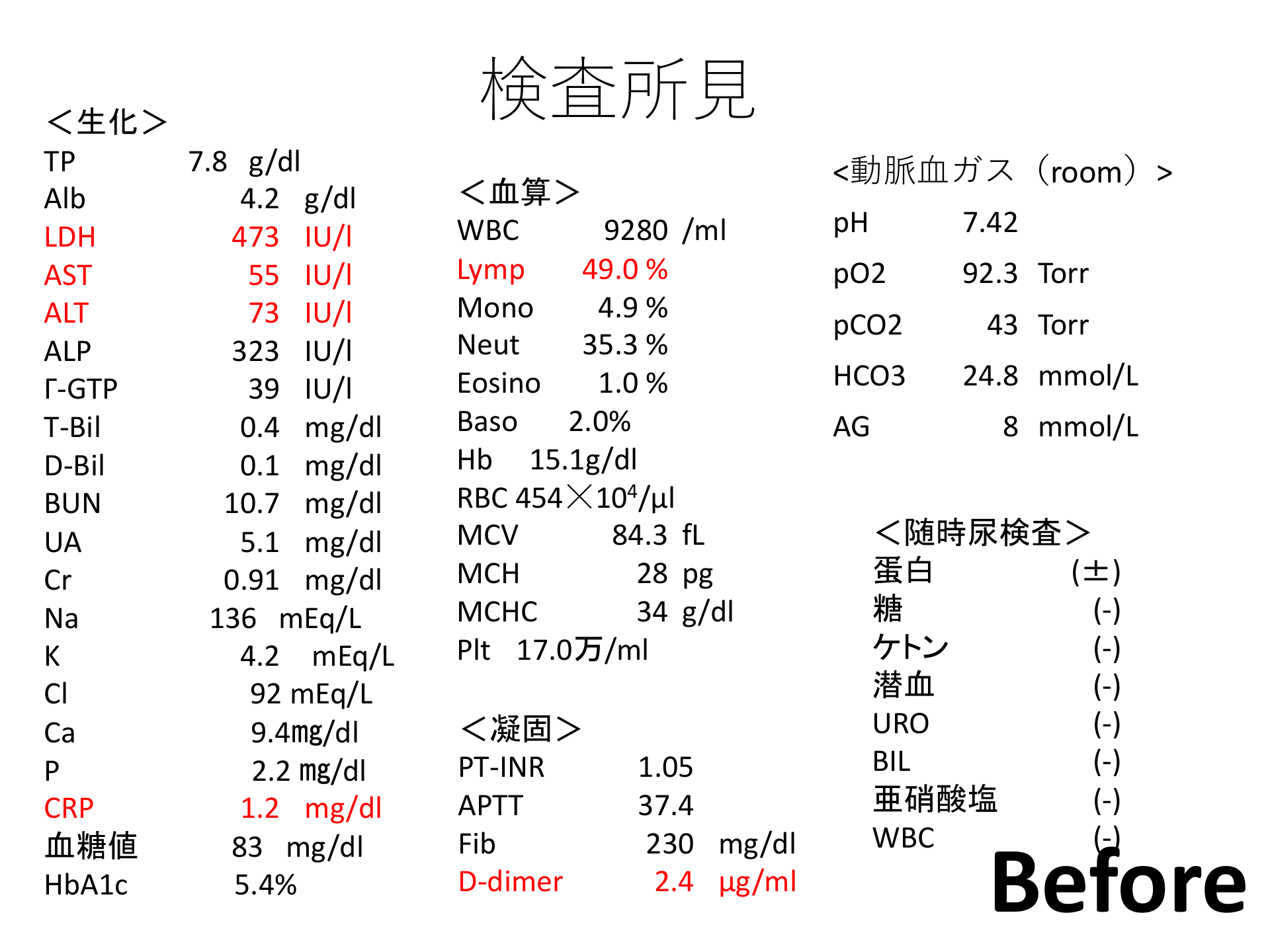 #13. <生化> TP 7.8 g/dl Alb 4.2 g/dl LDH 473 IU/l AST 55 IU/l ALT 73 IU/l ALP 323 IU/l Γ-GTP 39 IU/l T-Bil 0.4 mg/dl D-Bil 0.1 mg/dl BUN 10.7 mg/dl UA 5.1 mg/dl Cr 0.91 mg/dl Na 136 mEq/L K 4.2 mEq/L Cl 92 mEq/L Ca 9.4㎎/dl P 2.2 ㎎/dl CRP 1.2 mg/dl 血糖値 83 mg/dl HbA1c 5.4% 検査所見 <血算> WBC 9280 Lymp 49.0 % Mono 4.9 % Neut 35.3 % Eosino 1.0 % Baso 2.0% Hb 15.1g/dl RBC 454☓104/μ MCV 84.3 MCH 28 MCHC 34 Plt 17.0万/ml <凝固> PT-INR APTT Fib D-dimer <動脈血ガス(room)> /ml pH 7.42 pO2 92.3 Torr pCO2 HCO3 AG fL pg g/dl 1.05 37.4 230 mg/dl 2.4 μ /ml 43 Torr 24.8 mmol/L 8 mmol/L <随時尿検査> 蛋白 (±) 糖 (-) ケトン (-) 潜血 (-) URO (-) BIL (-) 亜硝酸塩 (-) WBC (-) Before