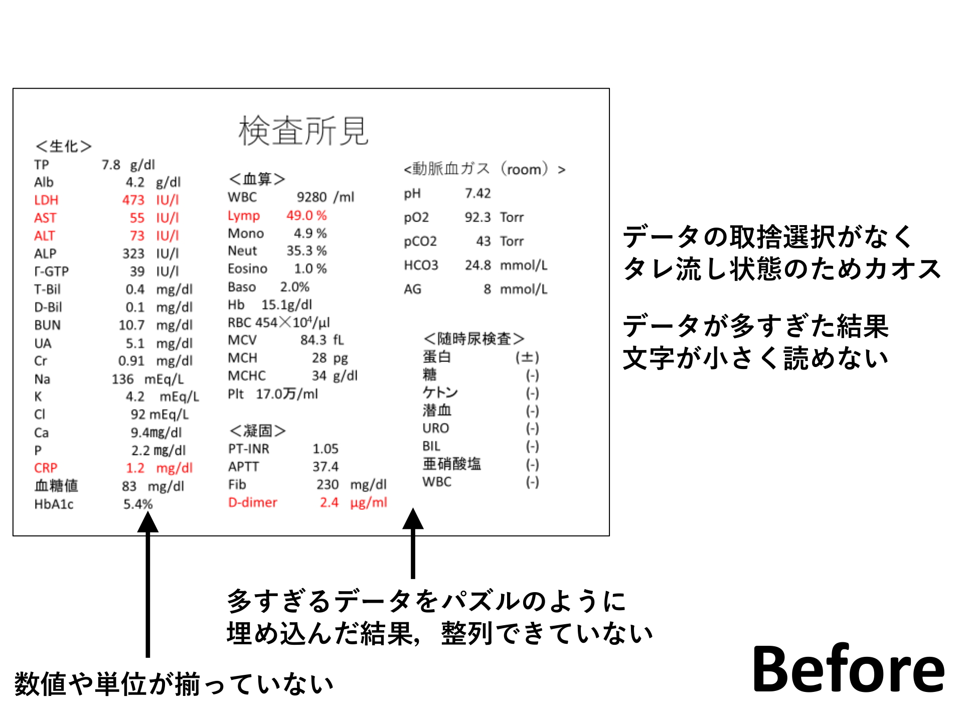#14. データの取捨選択がなく タレ流し状態のためカオス データが多すぎた結果 文字が小さく読めない 多すぎるデータをパズルのように 埋め込んだ結果,整列できていない 数値や単位が揃っていない Before