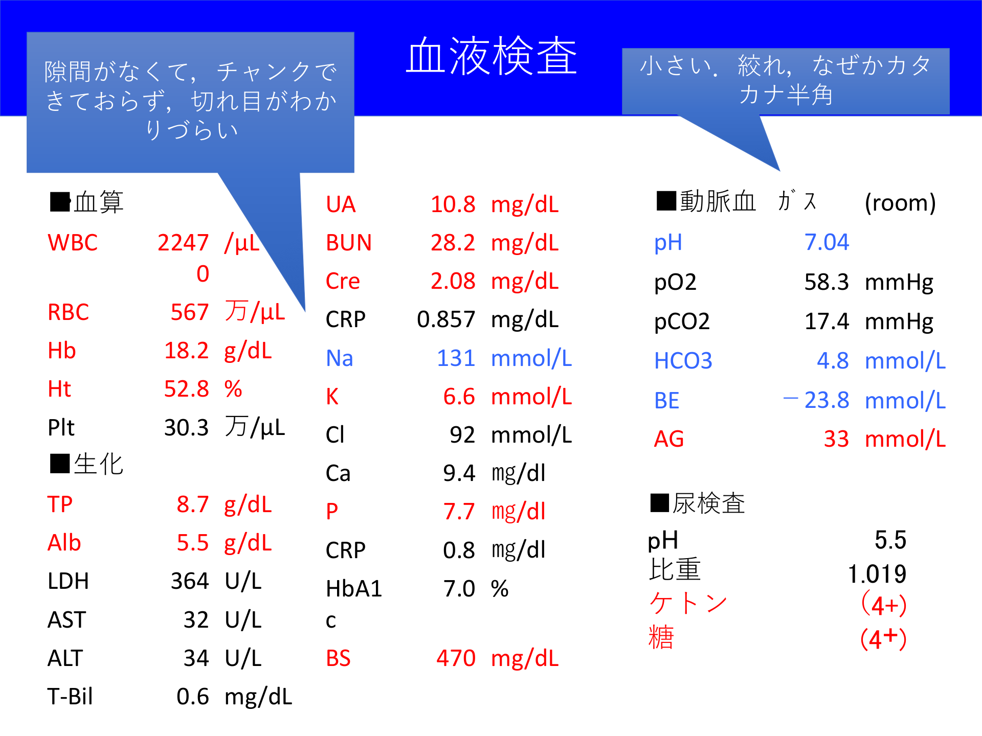 #16. 隙間がなくて,チャンクで きておらず,切れ目がわか りづらい ■血算 ・ WBC RBC Hb Ht Plt ■生化 TP Alb LDH AST ALT T-Bil 2247 0 567 18.2 52.8 30.3 8.7 5.5 364 32 34 0.6 /μL 万/μL g/dL % 万/μL g/dL g/dL U/L U/L U/L mg/dL UA BUN Cre CRP Na K Cl Ca P CRP HbA1 c BS 血液検査 10.8 28.2 2.08 0.857 131 6.6 92 9.4 7.7 0.8 7.0 mg/dL mg/dL mg/dL mg/dL mmol/L mmol/L mmol/L ㎎/dl ㎎/dl ㎎/dl % 470 mg/dL 小さい.絞れ,なぜかカタ カナ半角 ■動脈血 ガス (room) pH 7.04 pO2 58.3 mmHg pCO2 17.4 mmHg HCO3 BE AG 4.8 mmol/L -23.8 mmol/L 33 mmol/L ■尿検査 pH 比重 ケトン 糖 5.5 1.019 (4+) (4+)