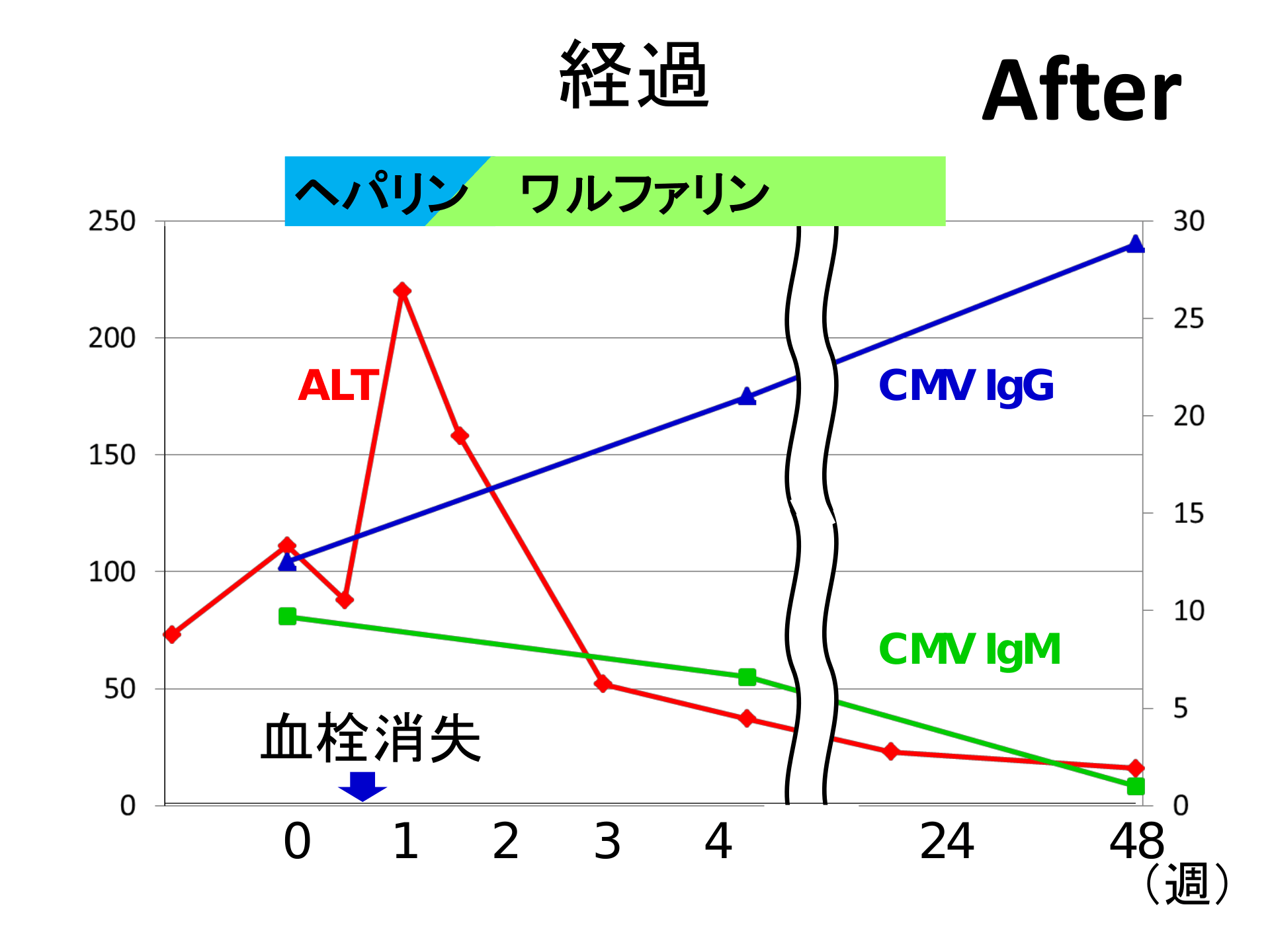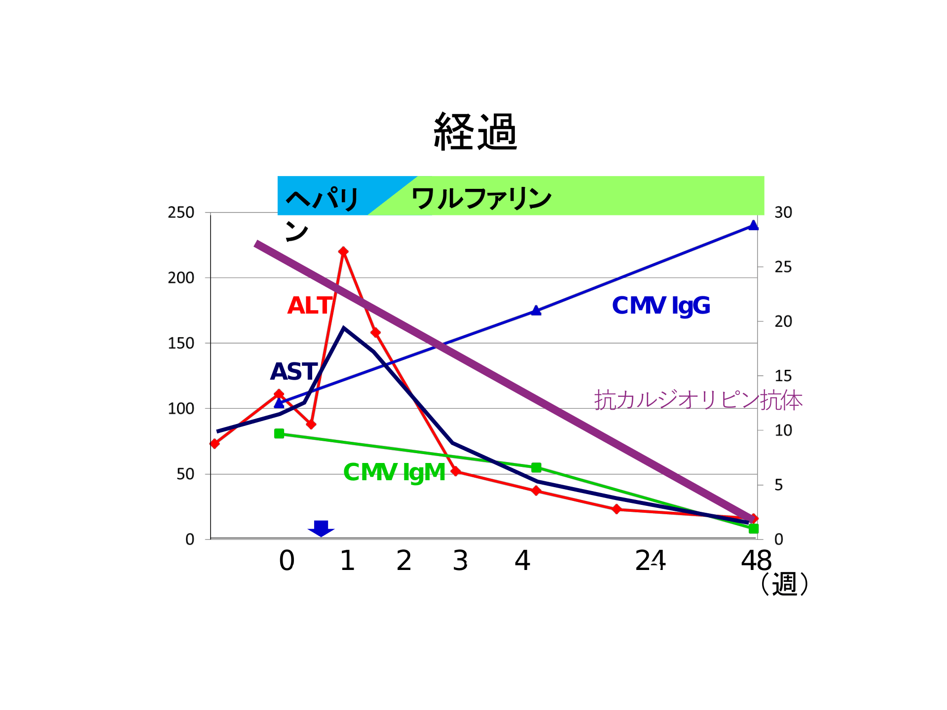 #22. 経過 After ヘパリン ワルファリン ALT CMV IgG CMV IgM 血栓消失 0 1 2 3 4 24 48 (週)