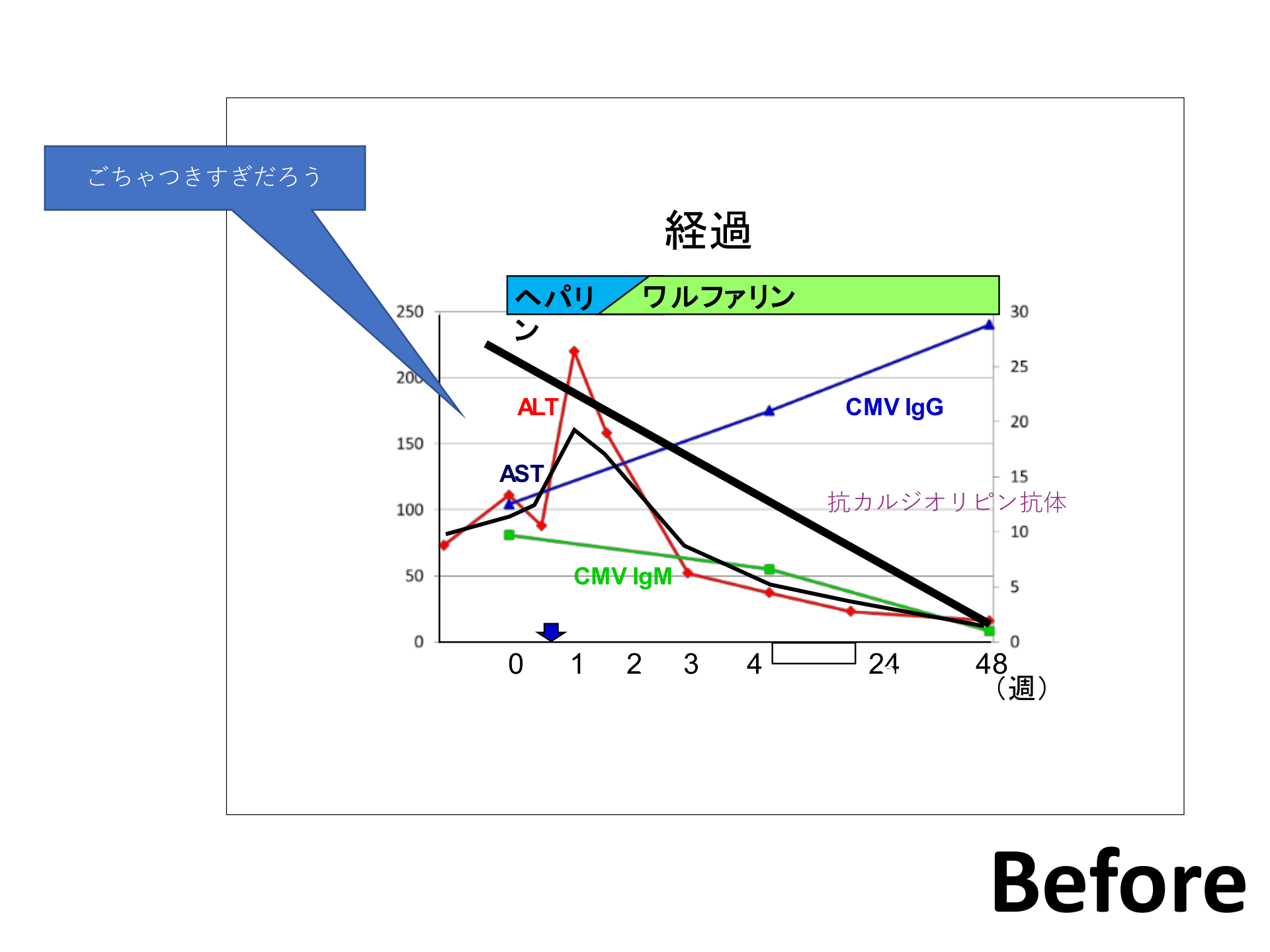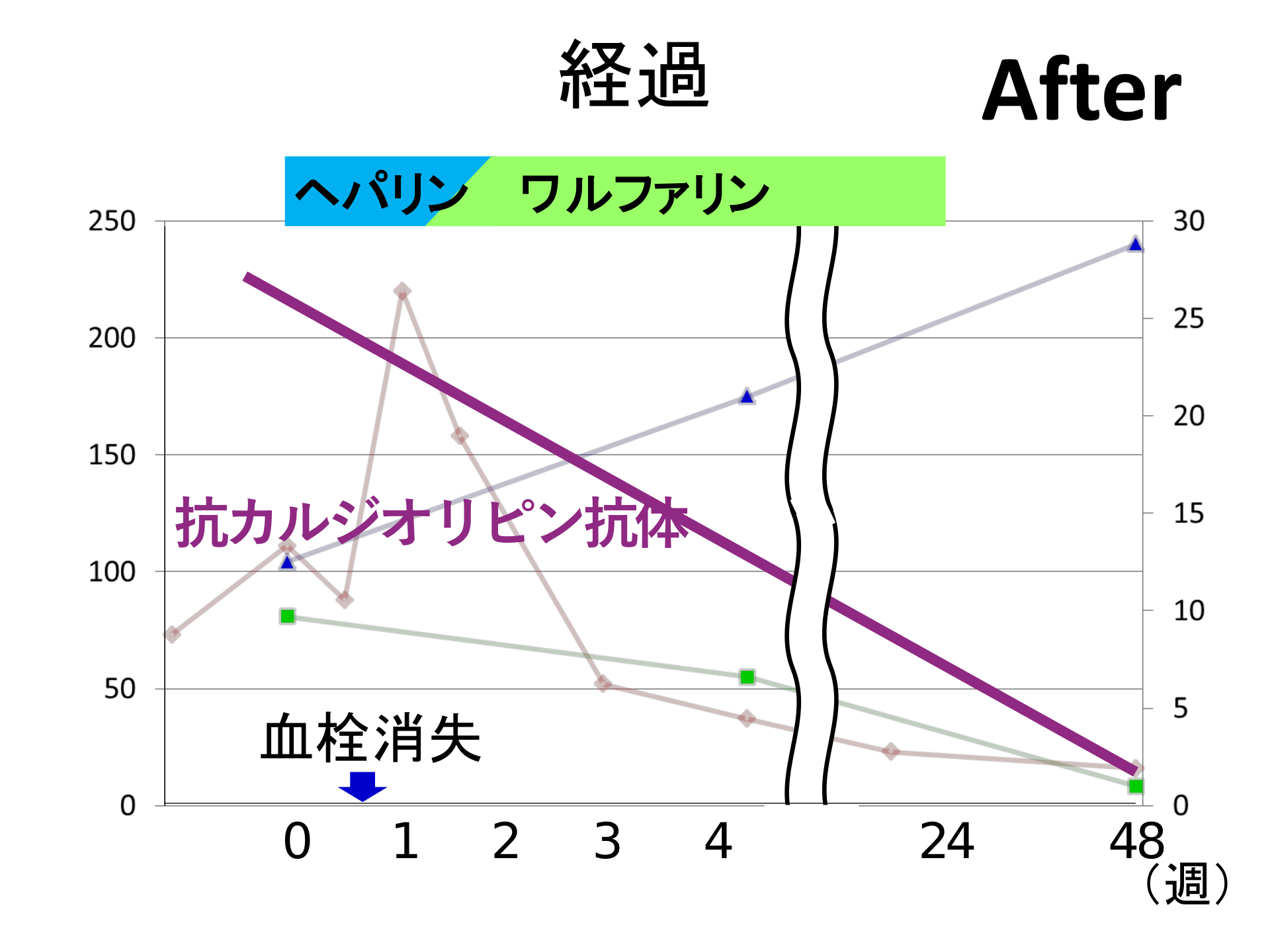 #21. ごちゃつきすぎだろう 経過 ヘパリ ン ワルファリン 抗カルジオリピン抗 血栓消失 (週) Before