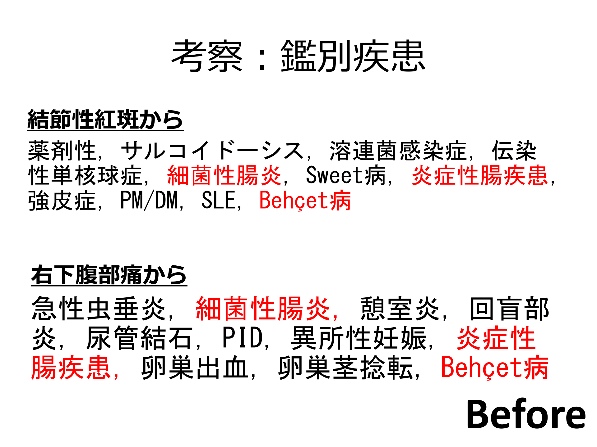 #24. 考察:鑑別疾患 結節性紅斑から 薬剤性,サルコイドーシス,溶連菌感染症,伝染 性単核球症,細菌性腸炎,Sweet病,炎症性腸疾患, 強皮症,PM/DM,SLE,Behçet病 右下腹部痛から 急性虫垂炎,細菌性腸炎,憩室炎,回盲部 炎,尿管結石,PID,異所性妊娠,炎症性 腸疾患,卵巣出血,卵巣茎捻転,Behçet病 Before