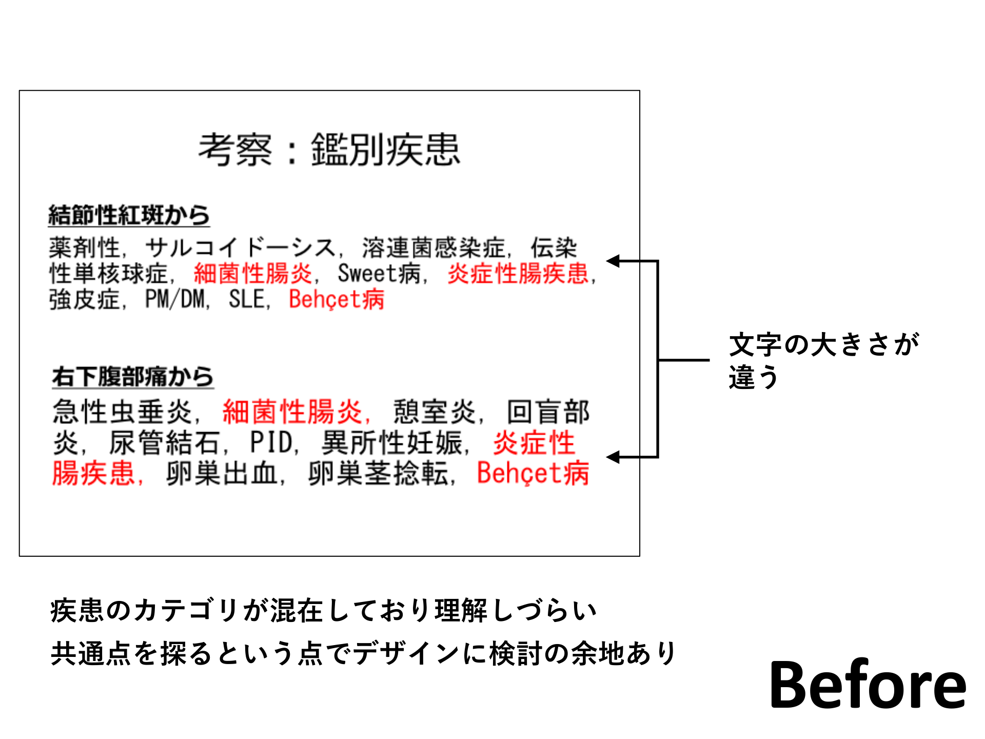 #25. 文字の大きさが 違う 疾患のカテゴリが混在しており理解しづらい 共通点を探るという点でデザインに検討の余地あり Before