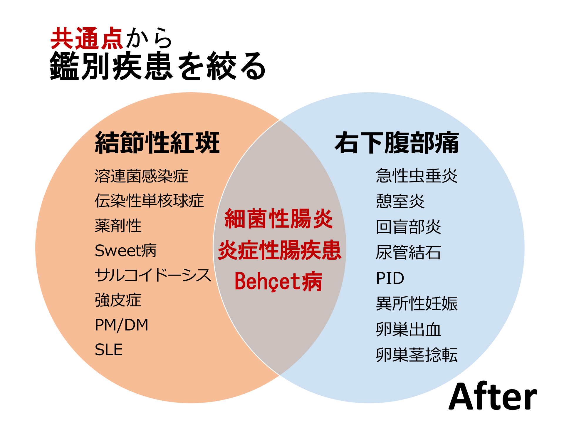 #26. 共通点から 鑑別疾患を絞る 結節性紅斑 右下腹部痛 溶連菌感染症 急性虫垂炎 伝染性単核球症 憩室炎 薬剤性 回盲部炎 細菌性腸炎 Sweet病 炎症性腸疾患 サルコイドーシス Behçet病 尿管結石 PID 強皮症 異所性妊娠 PM/DM 卵巣出血 SLE 卵巣茎捻転 After