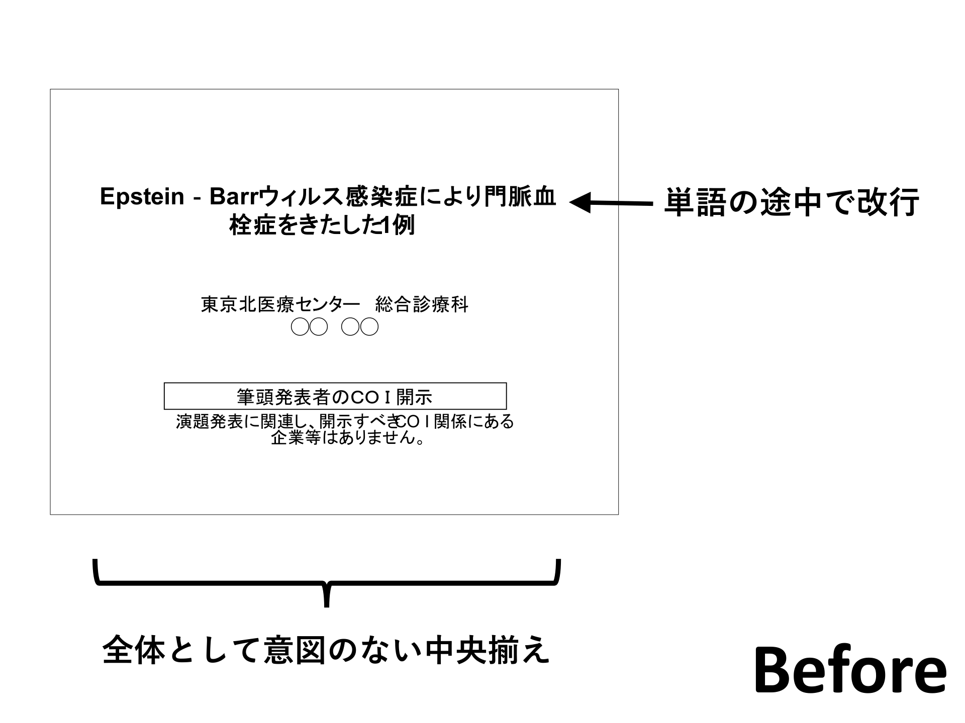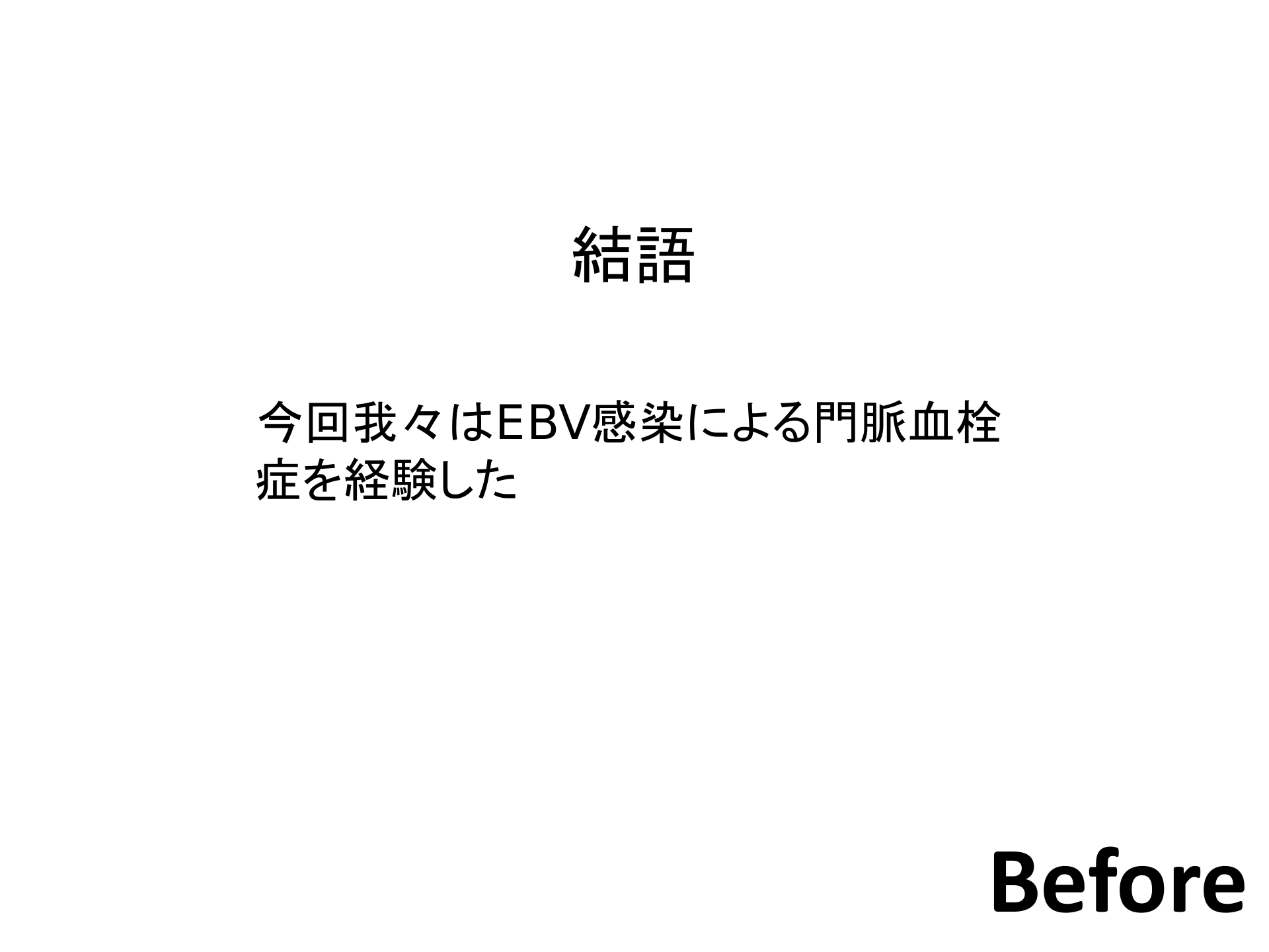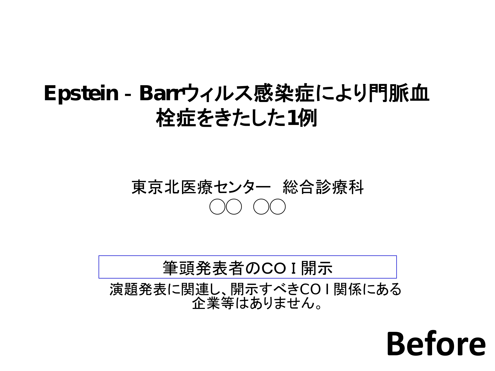 #5. ウィルス感染症により門脈血 栓症をきたした 例 単語の途中で改行 東京北医療センター 総合診療科 筆頭発表者のCO I 開示 演題発表に関連し、開示すべき 関係にある 企業等はありません。 全体として意図のない中央揃え Before