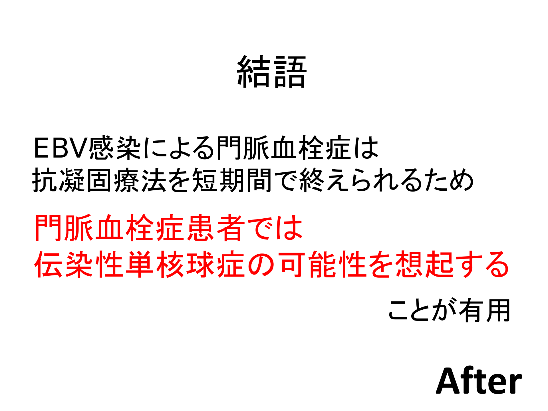 #29. 結語 EBV感染による門脈血栓症は 抗凝固療法を短期間で終えられるため 門脈血栓症患者では 伝染性単核球症の可能性を想起する ことが有用 After