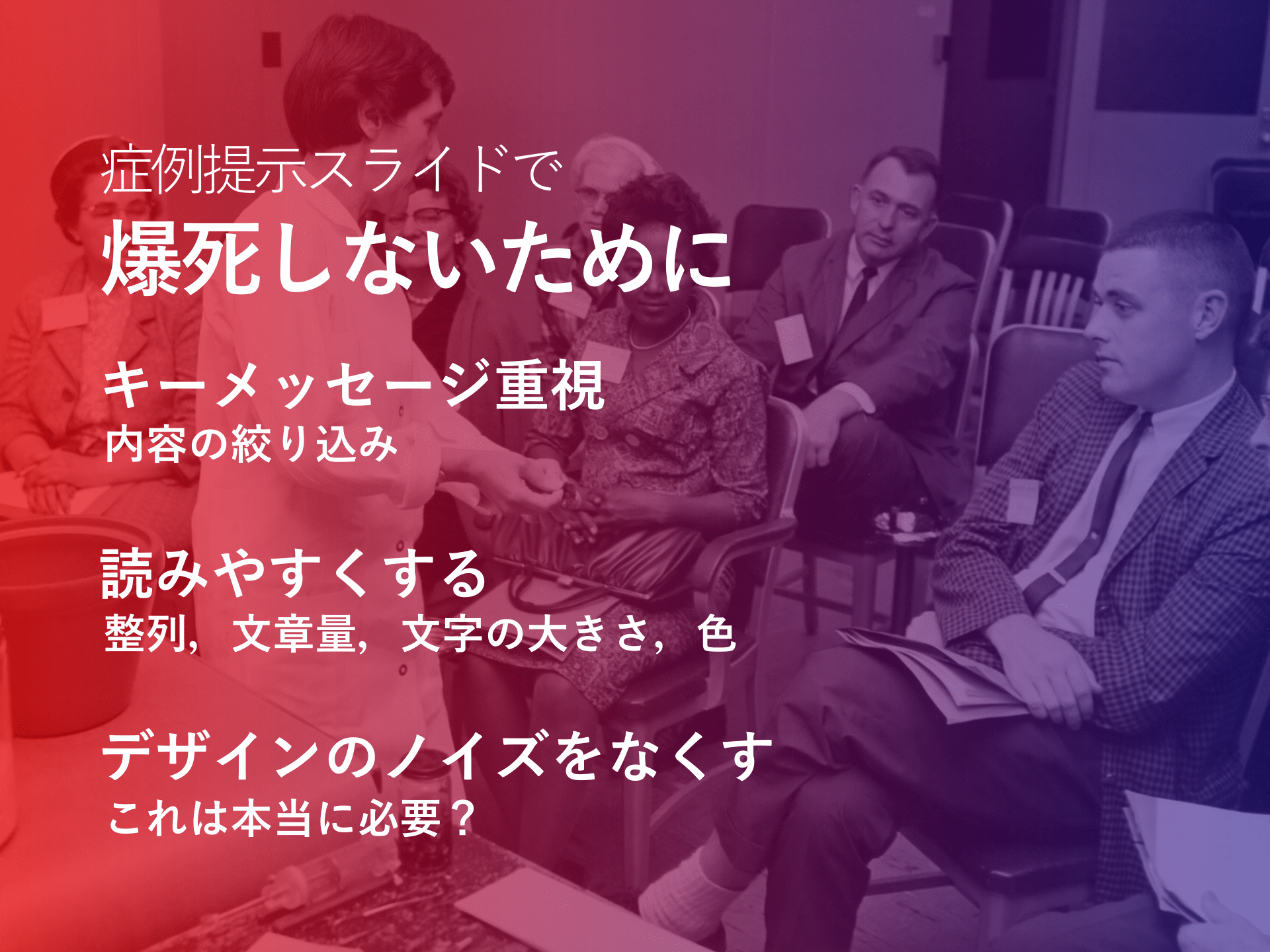 #3. 症例提示スライドで 爆死しないために キーメッセージ重視 内容の絞り込み 読みやすくする 整列,文章量,文字の大きさ,色 デザインのノイズをなくす これは本当に必要?