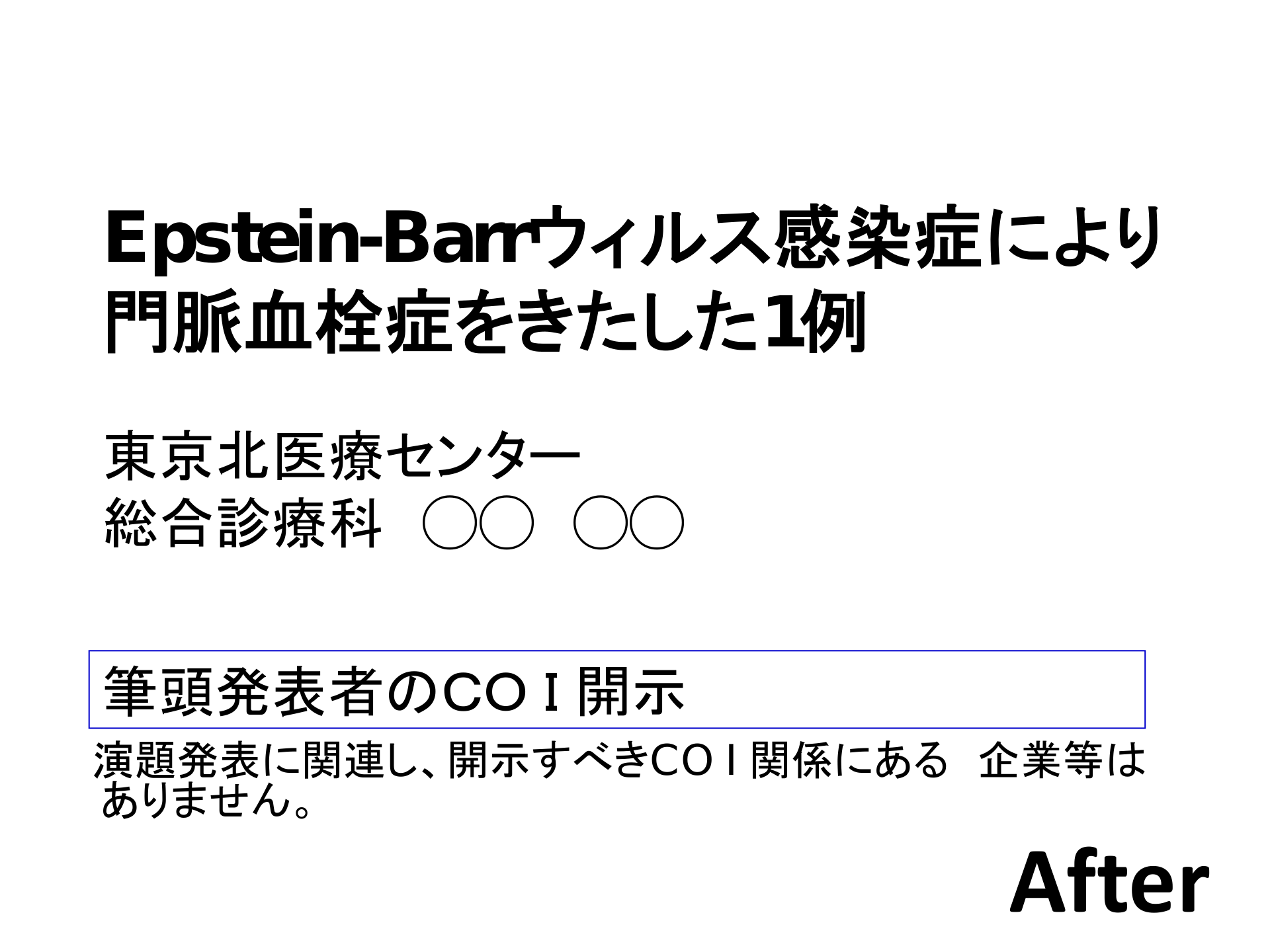 #4. Epstein‐Barrウィルス感染症により門脈血 栓症をきたした1例 東京北医療センター 総合診療科 ◯◯ ◯◯ 筆頭発表者のCO I 開示 演題発表に関連し、開示すべきCO I 関係にある 企業等はありません。 Before