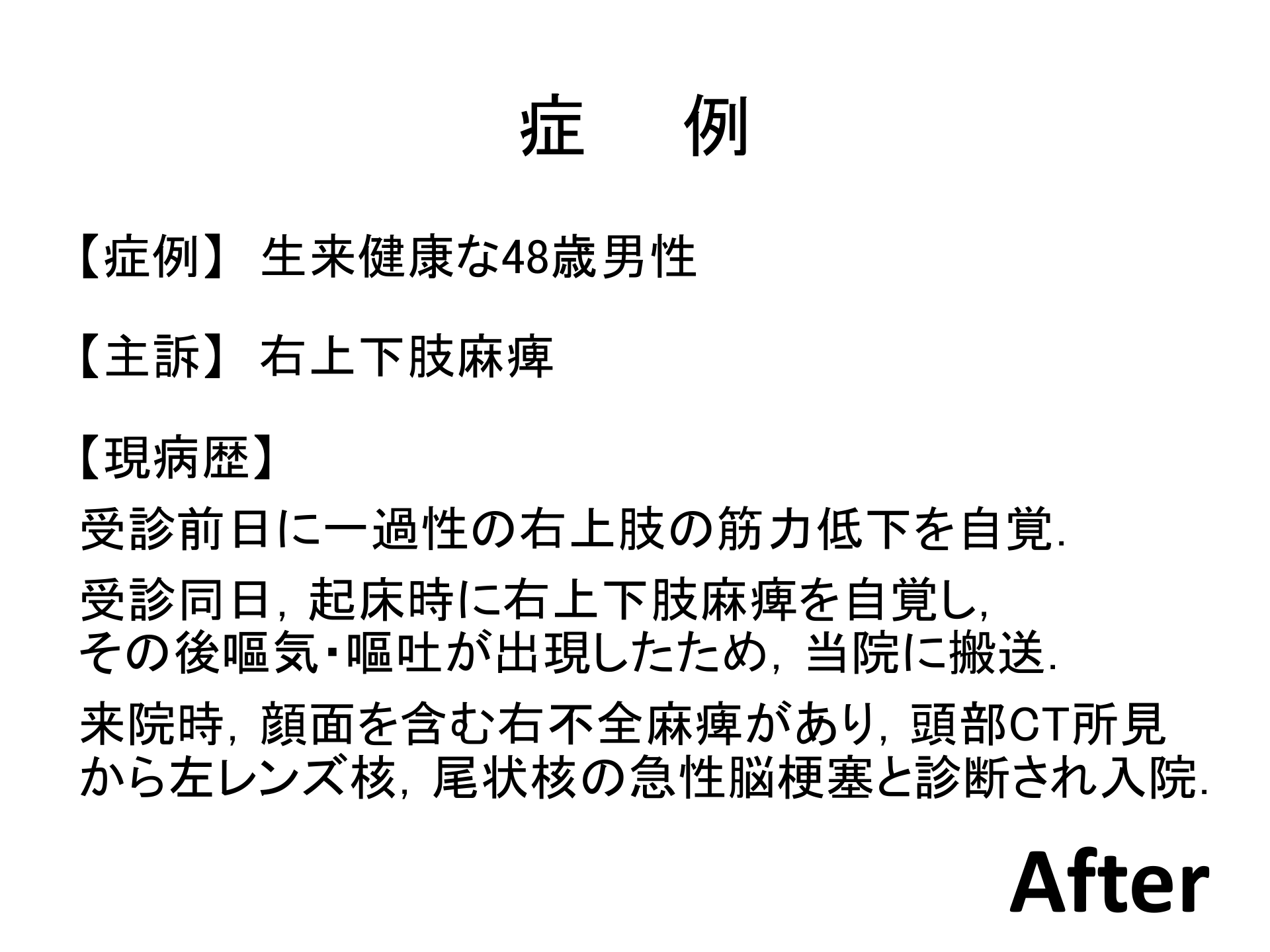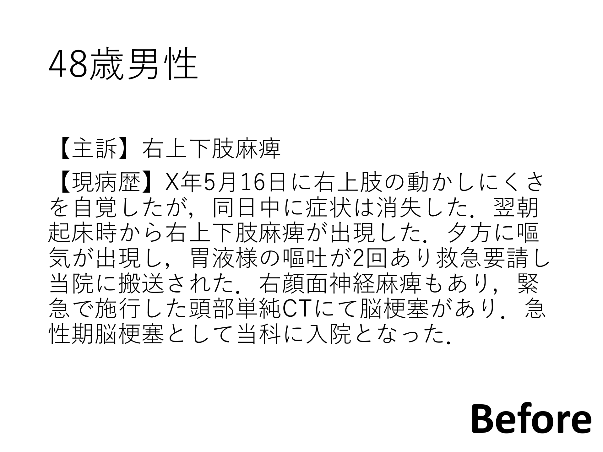 #7. 48歳男性 【主訴】右上下肢麻痺 【現病歴】X年5月16日に右上肢の動かしにくさ を自覚したが,同日中に症状は消失した.翌朝 起床時から右上下肢麻痺が出現した.夕方に嘔 気が出現し,胃液様の嘔吐が2回あり救急要請し 当院に搬送された.右顔面神経麻痺もあり,緊 急で施行した頭部単純CTにて脳梗塞があり.急 性期脳梗塞として当科に入院となった. Before