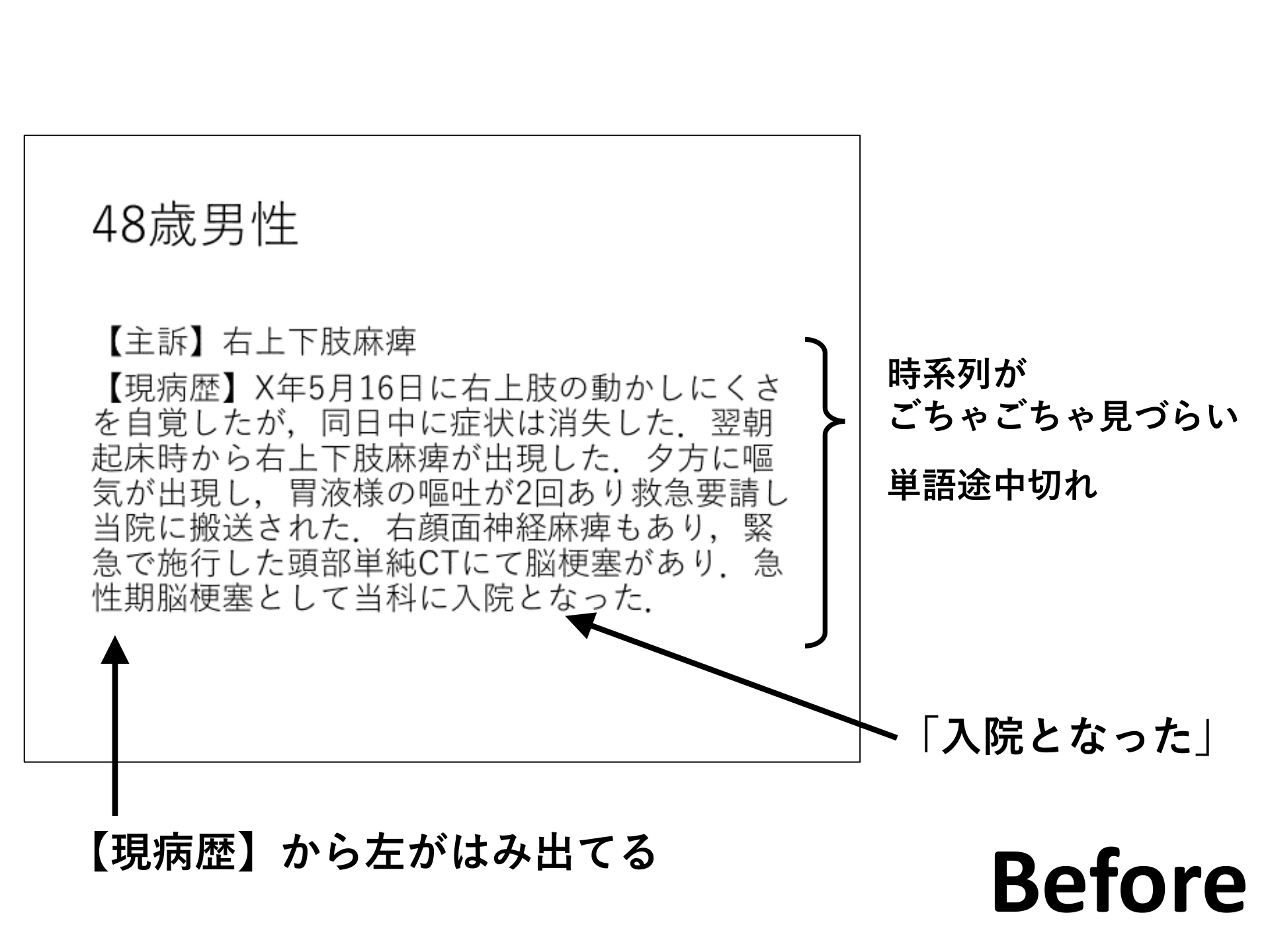 #8. 時系列が ごちゃごちゃ見づらい 単語途中切れ 「入院となった」 【現病歴】から左がはみ出てる Before