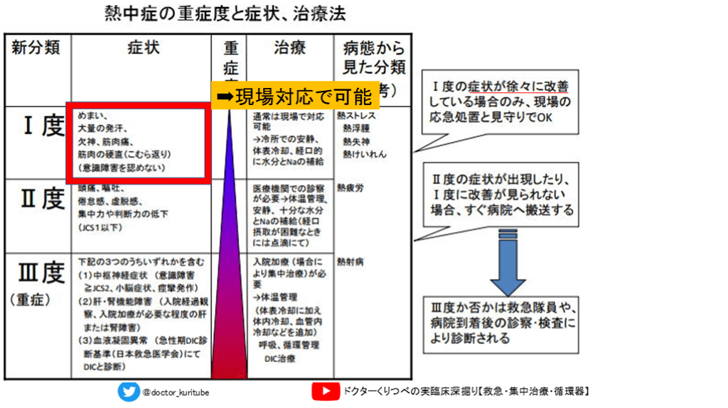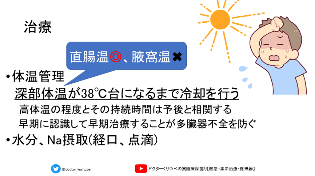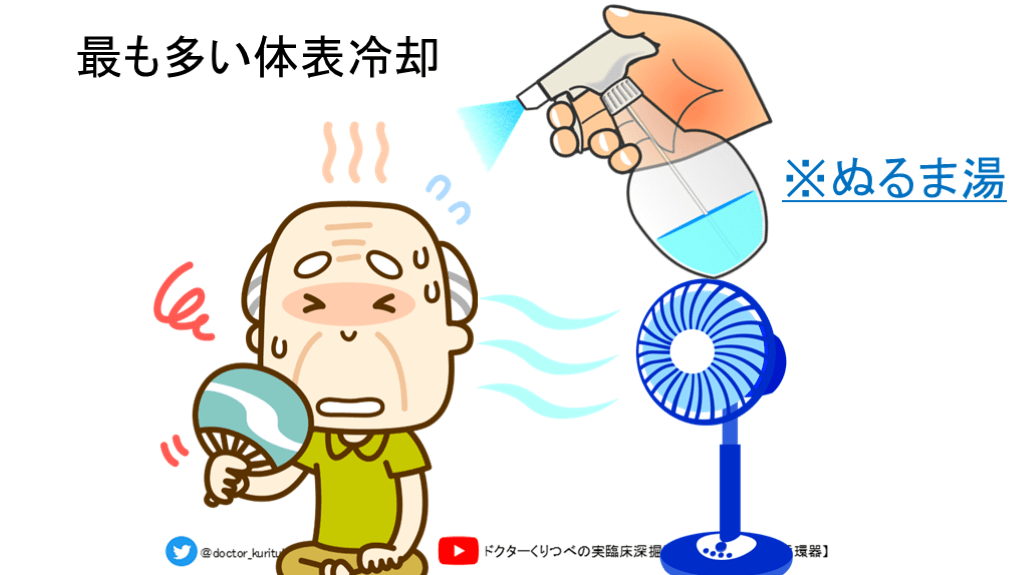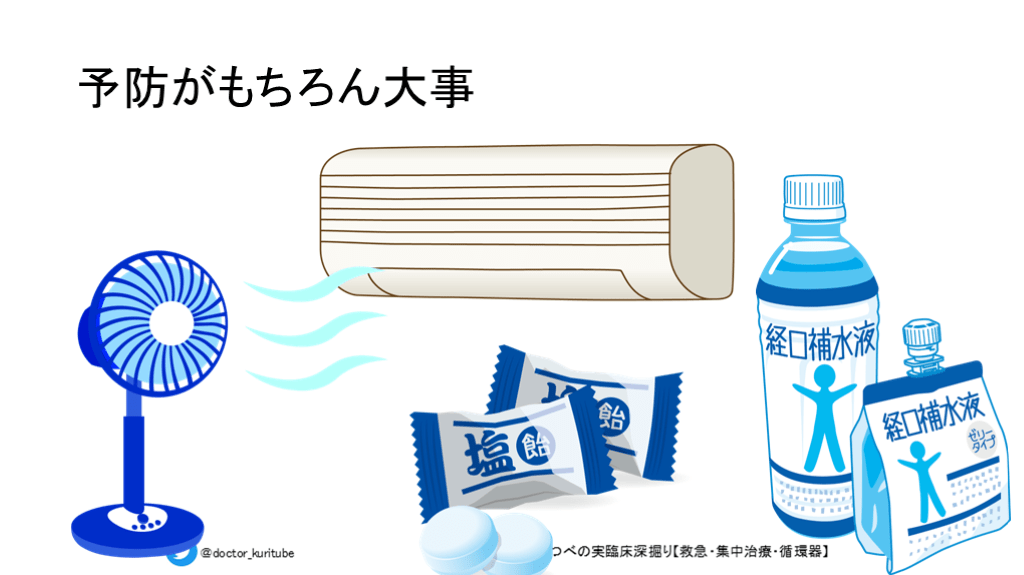 治療はクーリング(霧吹き+送風)、水分・Na摂取(経口補水液が推奨)
