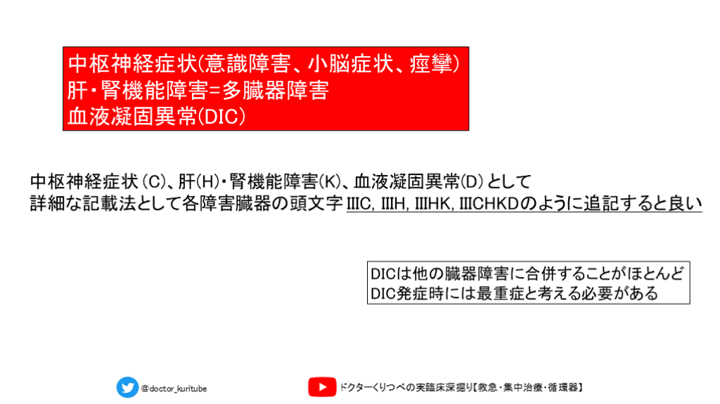 詳細な記載法として各障害臓器の頭文字 IIIC, IIIH, IIIHK, IIICHKDのように追記すると良い DICは他の臓器障害に合併することがほとんど