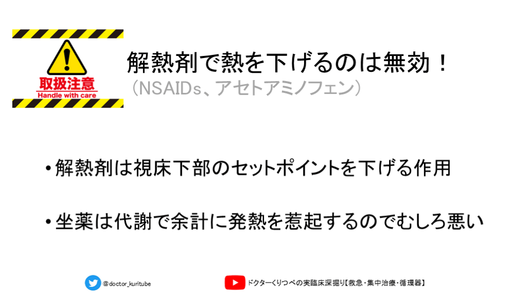 坐薬は代謝で余計に発熱を惹起するのでむしろ悪い (NSAIDs、アセトアミノフェン)