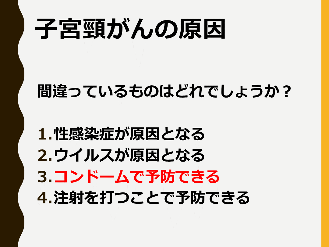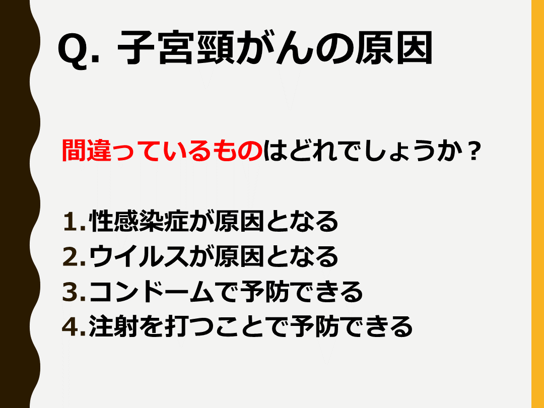 #15. Q. 子宮頸がんの原因 間違っているものはどれでしょうか?