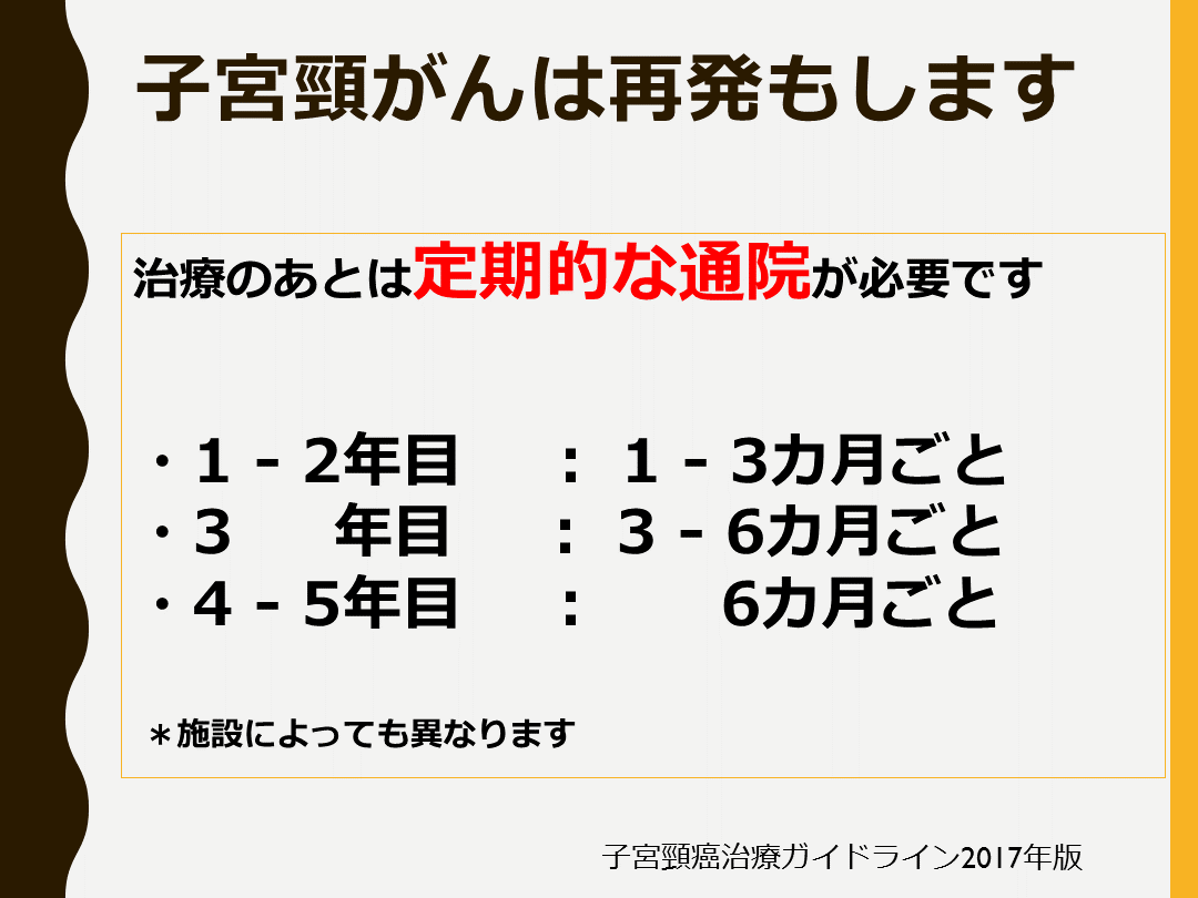 #32. 子宮頸がんは再発もします 子宮頸癌治療ガイドライン2017年版 治療のあとは定期的な通院が必要です