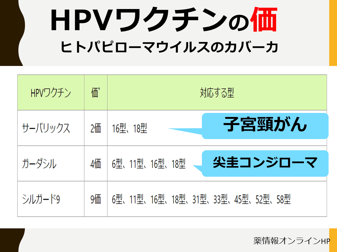 #50. 薬情報オンラインHP 子宮頸がん  HPVワクチンの価  ヒトパピローマウイルスのカバー力 尖圭コンジローマ