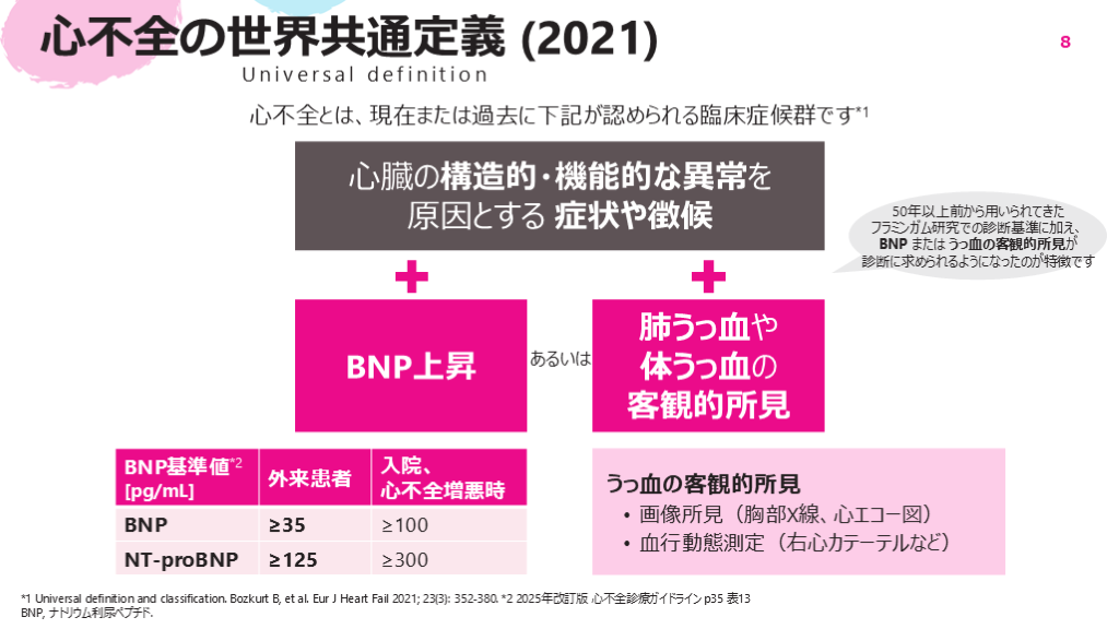 #8. 心不全の世界共通定義 (2021) *1 Universal definition and classification. Bozkurt B, et al. Eur J Heart Fail 2021; 23(3): 352-380. *2 2025年改訂版 心不全診療ガイドライン p35 表13
