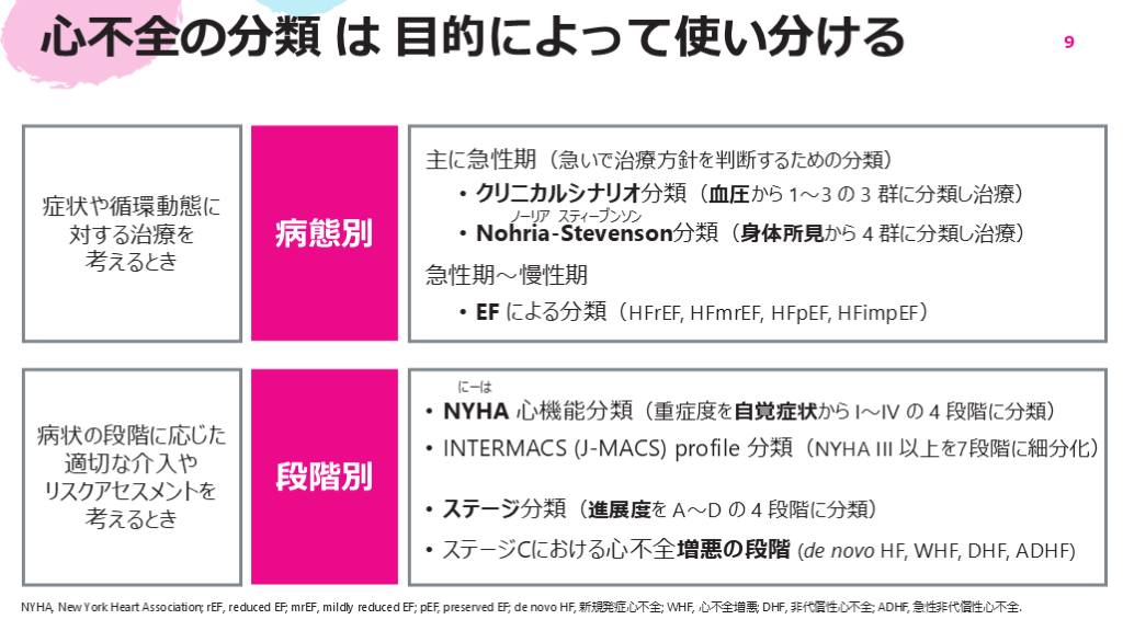 #9. 心不全の分類 は 目的によって使い分ける 病態別 段階別 症状や循環動態に対する治療を考えるとき 病状の段階に応じた適切な介入やリスクアセスメントを考えるとき 主に急性期(急いで治療方針を判断するための分類)