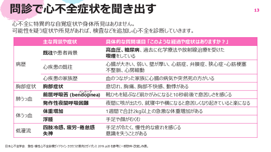#13. 問診で心不全症状を聞き出す 日本心不全学会.急性・慢性心不全診療ガイドライン かかりつけ医向けガイダンス 2019. p20 を参考に一部抜粋・改変し作表。 心不全に特異的な自覚症状や身体所見はありません。