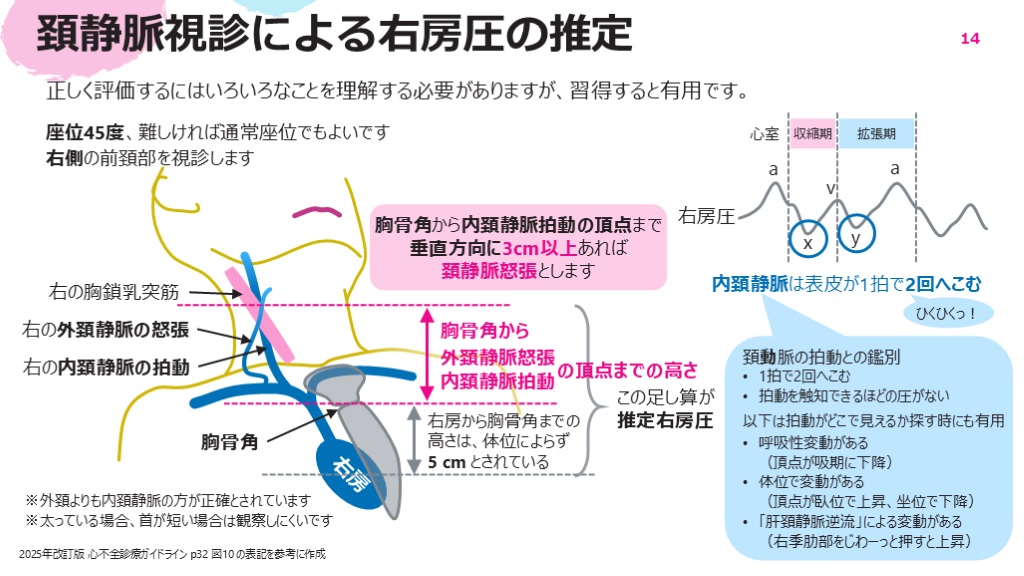 #14. 頚静脈視診による右房圧の推定 2025年改訂版 心不全診療ガイドライン p32 図10 の表記を参考に作成 座位45度、難しければ通常座位でもよいです