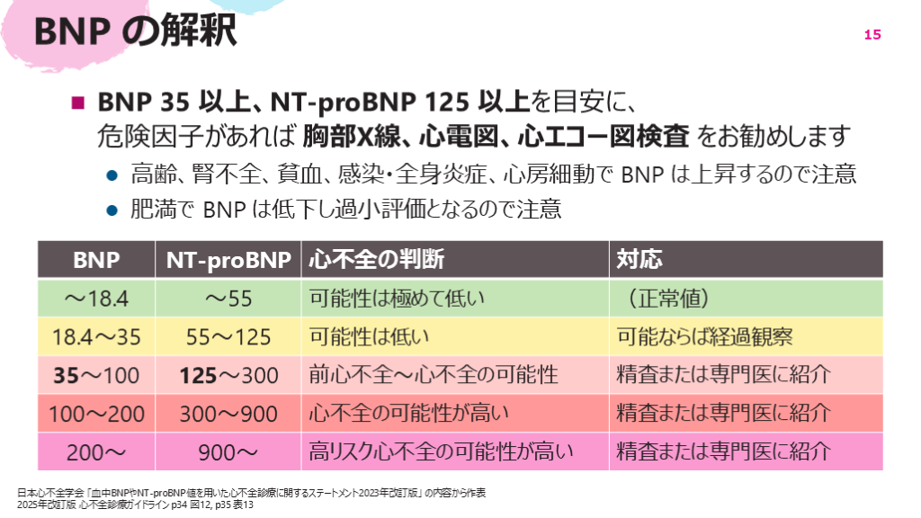 #15. BNP の解釈 BNP 35 以上、NT-proBNP 125 以上を目安に、危険因子があれば 胸部X線、心電図、心エコー図検査 をお勧めします