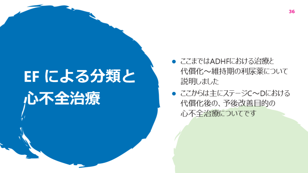 #36. EF による分類と心不全治療 ここまではADHFにおける治療と代償化~維持期の利尿薬について説明しました