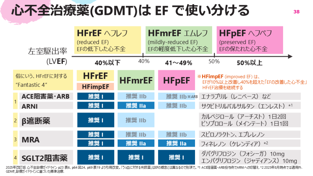 #38. 心不全治療薬(GDMT)は EF で使い分ける 2025年改訂版 心不全診療ガイドライン p23 表6、p64 図24、p69 表19 より引用改変。「うっ血に対する利尿薬」はEFの概念とは異なるので別項で。*1 ACE阻害薬・ARB投与例でARNIへの切替え. *2 2025年8月時点では適用外.