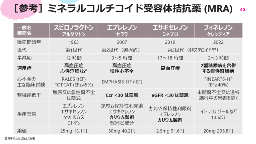 #40. [参考]ミネラルコルチコイド受容体拮抗薬 (MRA) 各電子添文などをもとに作表