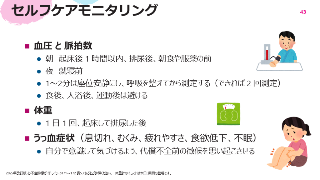 自分で意識して気づけるよう、代償不全前の徴候を思い起こさせる 2025年改訂版 心不全診療ガイドライン p171~172 表53 などをご参照ください。 体重計のイラストは本日3回目の登場です。