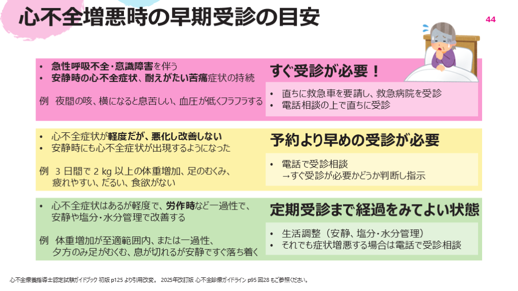 それでも症状増悪する場合は電話で受診相談 すぐ受診が必要! 予約より早めの受診が必要 定期受診まで経過をみてよい状態 心不全療養指導士認定試験ガイドブック 初版 p125 より引用改変。 2025年改訂版 心不全診療ガイドライン p95 図28 もご参照ください。