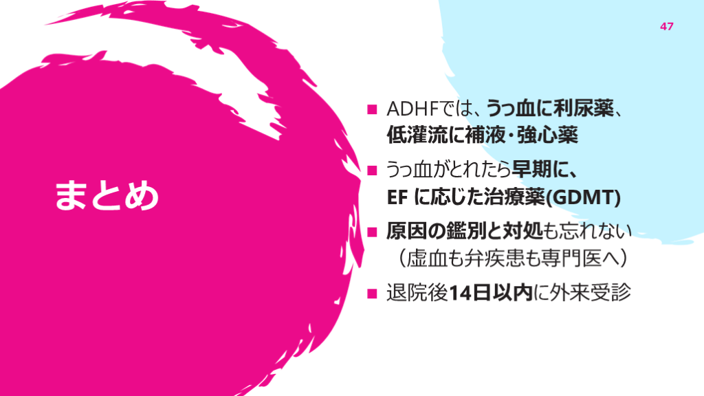 #47. まとめ ADHFでは、うっ血に利尿薬、低灌流に補液・強心薬